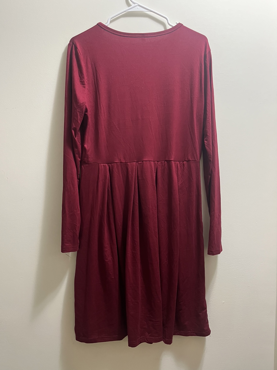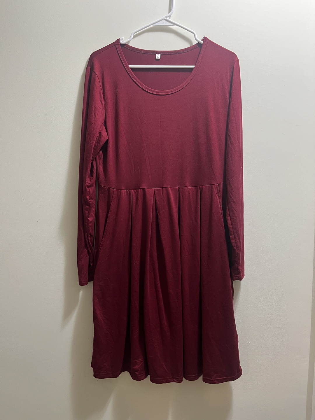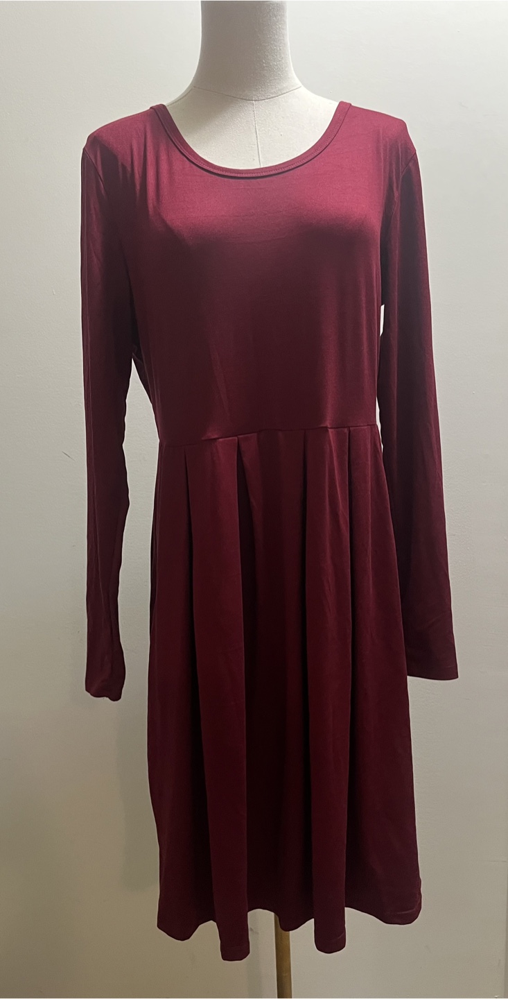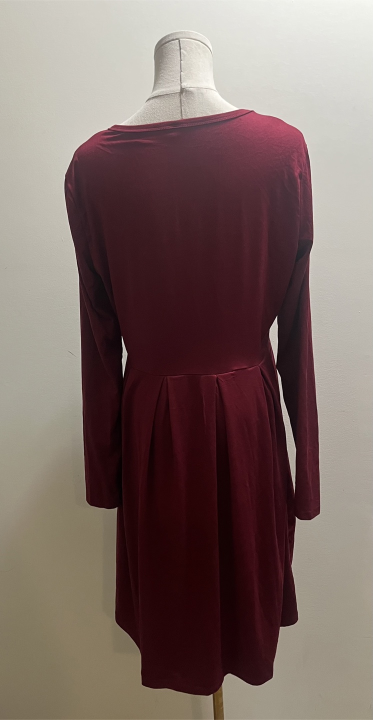 A lovely burgundy dress with long sleeves, perfect for cooler weather! It's a size large and features a comfortable, flattering fit. The dress also has handy pockets, making it both stylish and practical