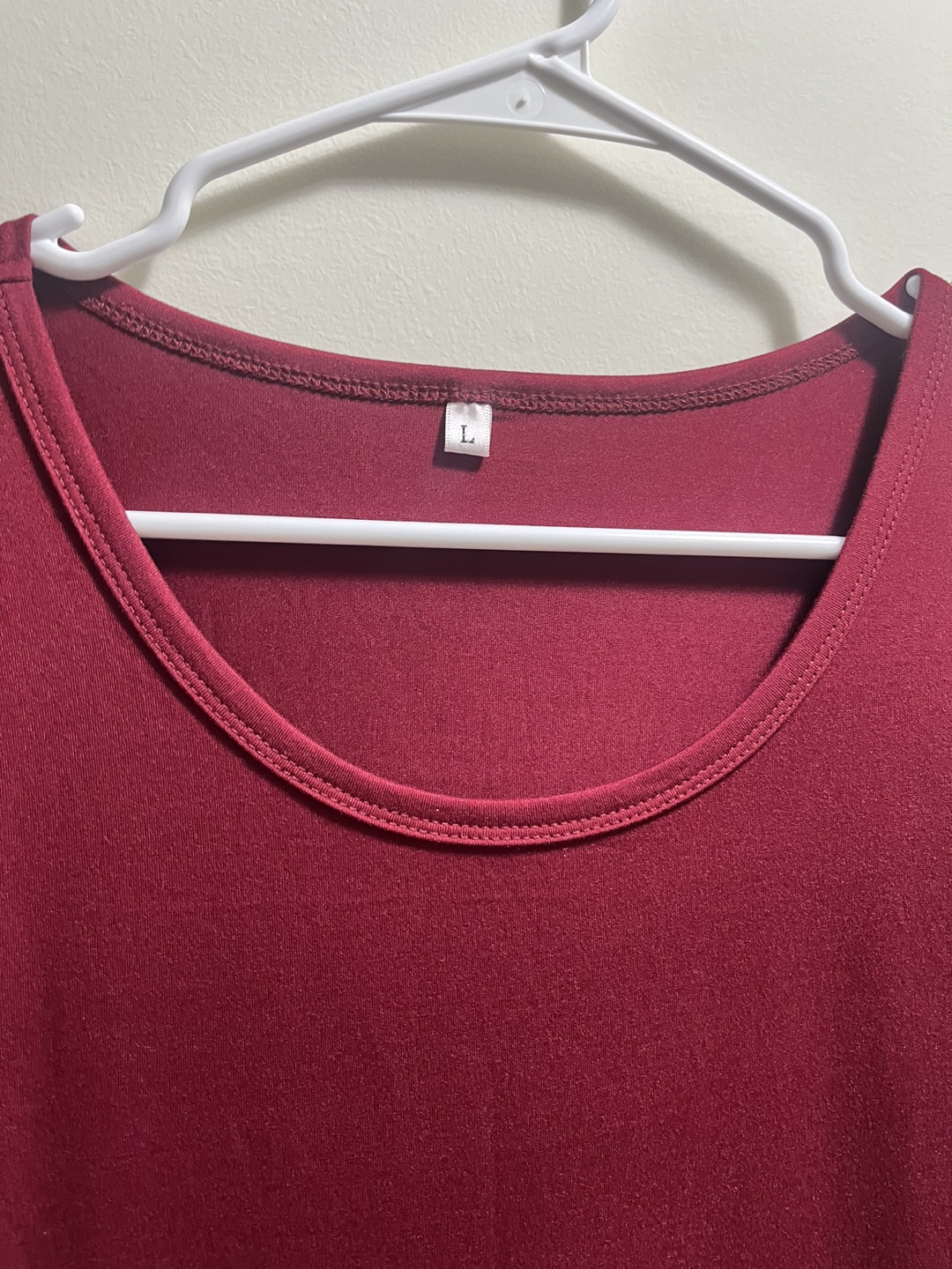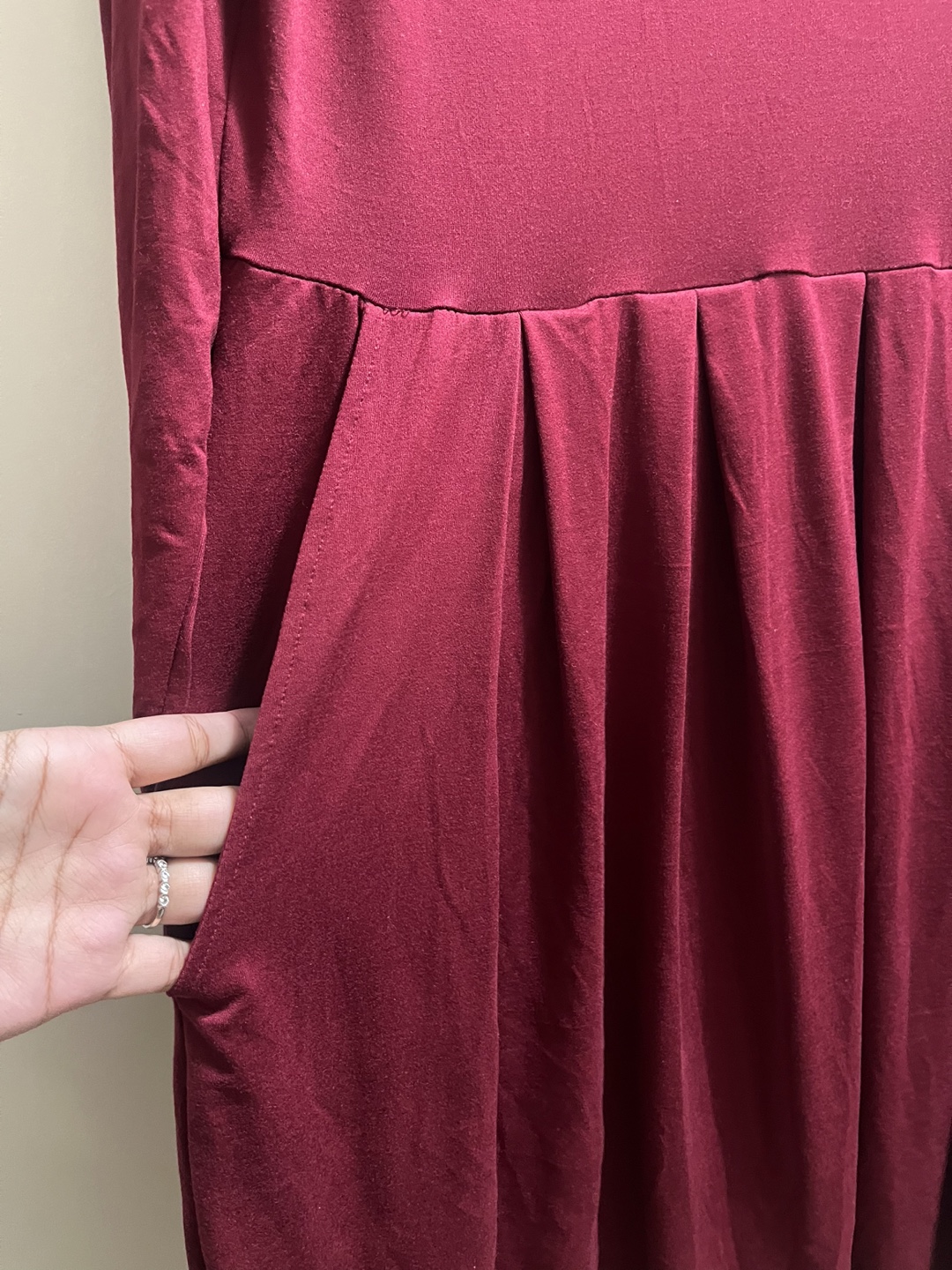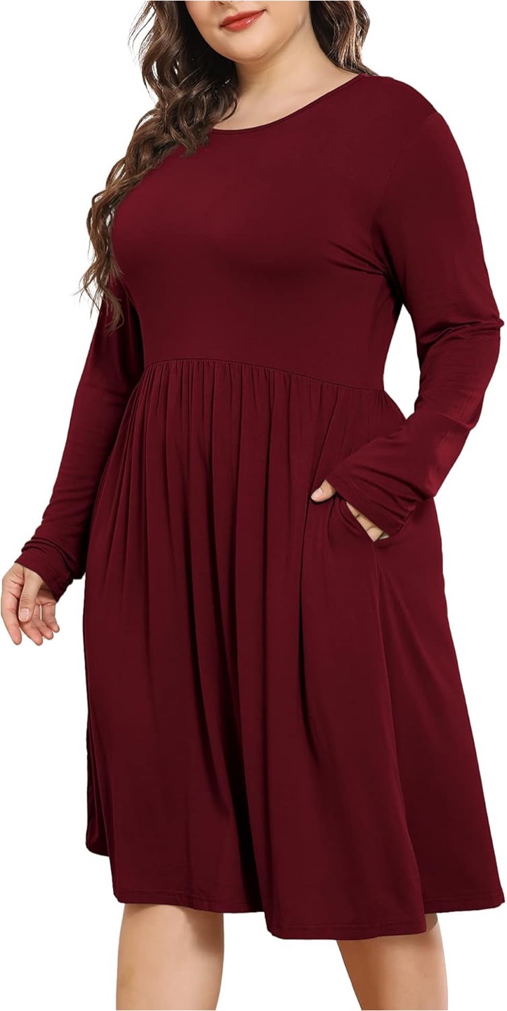 A lovely burgundy dress with long sleeves, perfect for cooler weather! It's a size large and features a comfortable, flattering fit. The dress also has handy pockets, making it both stylish and practical