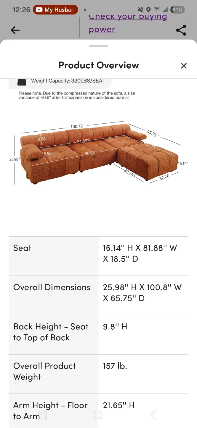 - Overall: 25.98" H x 100.8" W x 65.75" D
