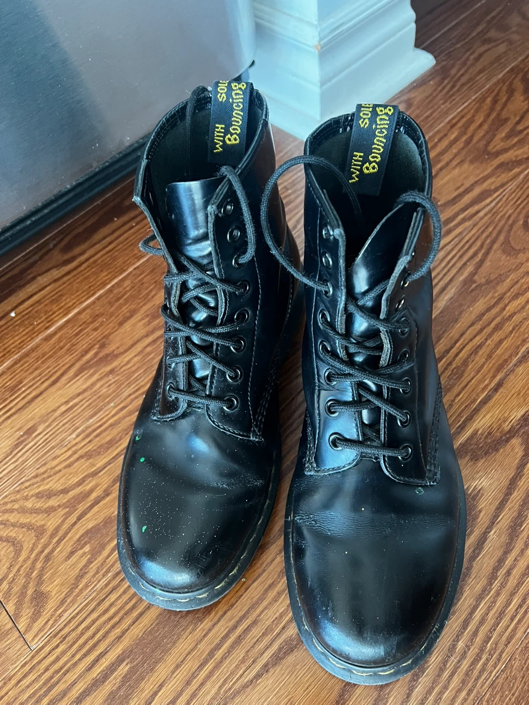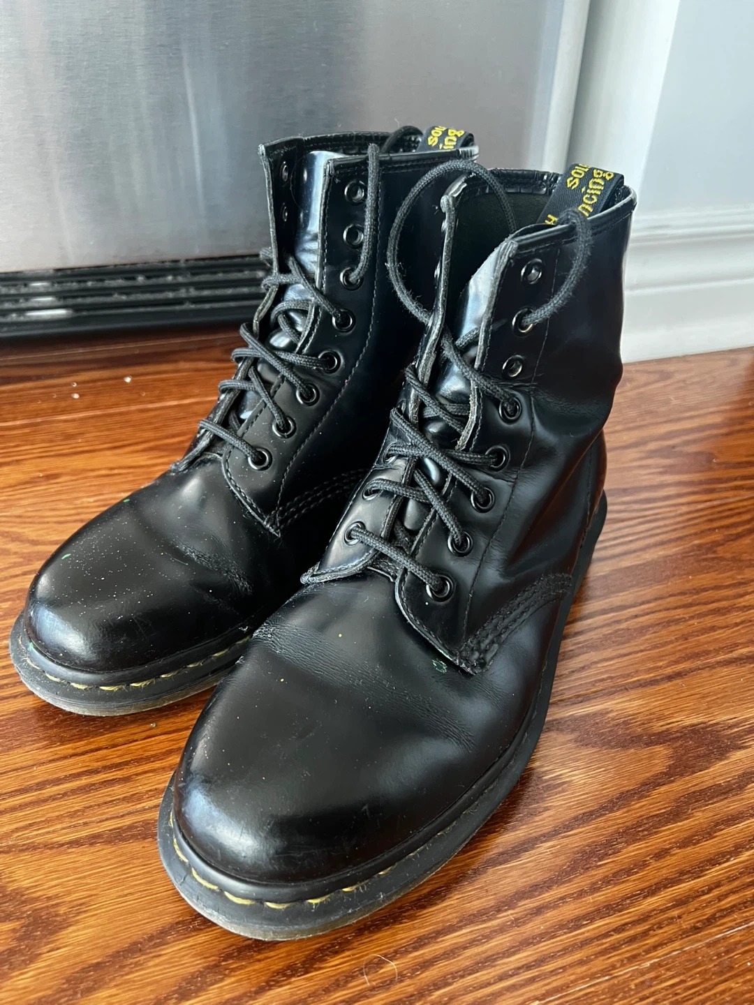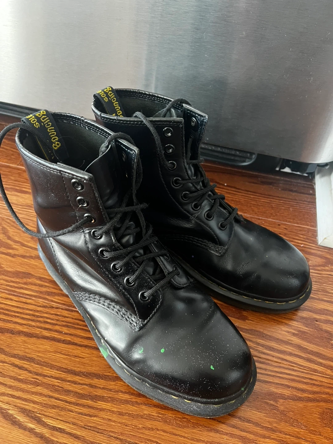 Selling a pair of classic Dr. Martens 1460 boots in black leather. These have the iconic yellow stitching and air-cushioned sole. They're in used condition, with some signs of wear and a bit of green paint, but still have lots of life left!