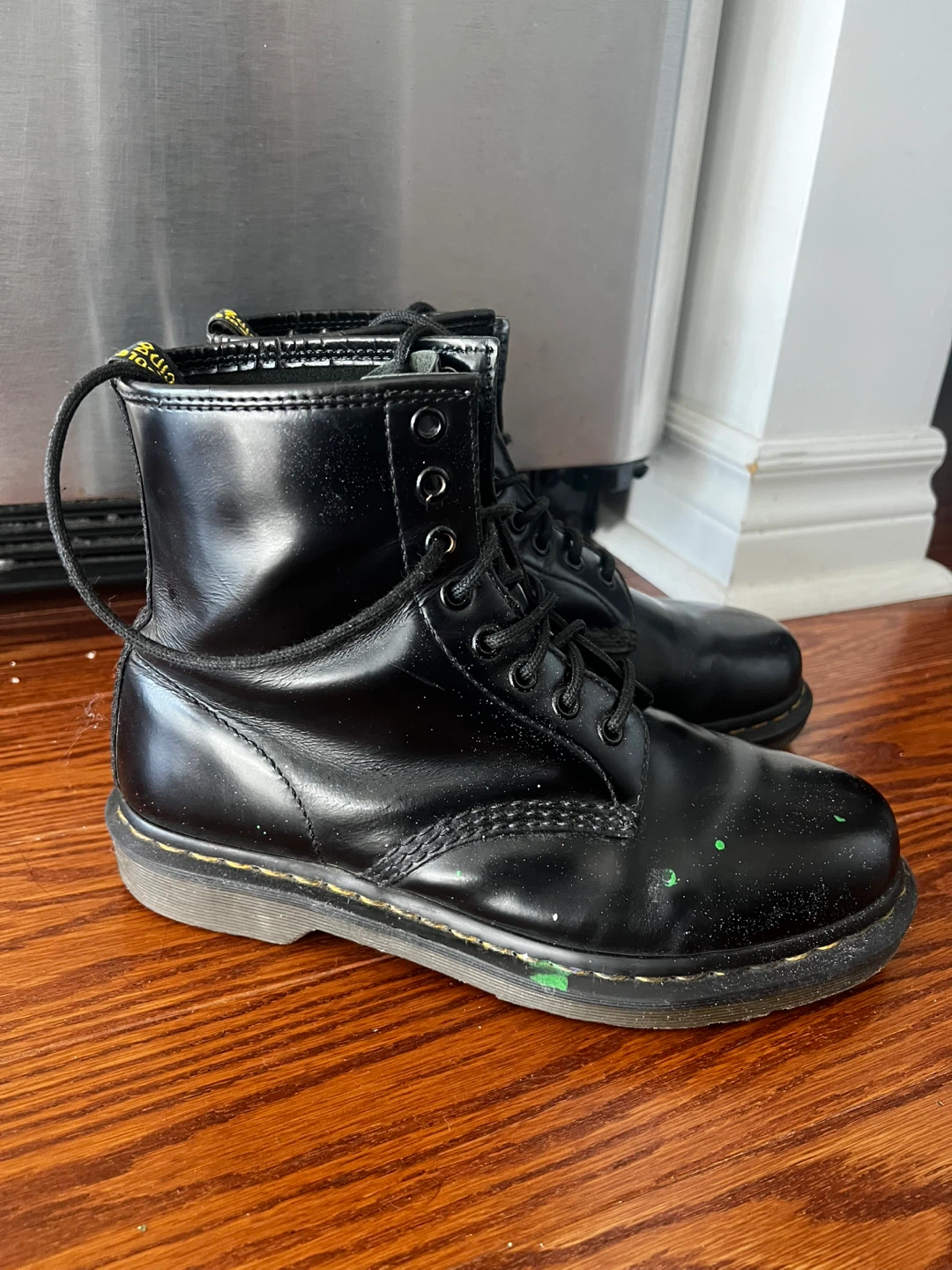 Selling a pair of classic Dr. Martens 1460 boots in black leather. These have the iconic yellow stitching and air-cushioned sole. They're in used condition, with some signs of wear and a bit of green paint, but still have lots of life left!