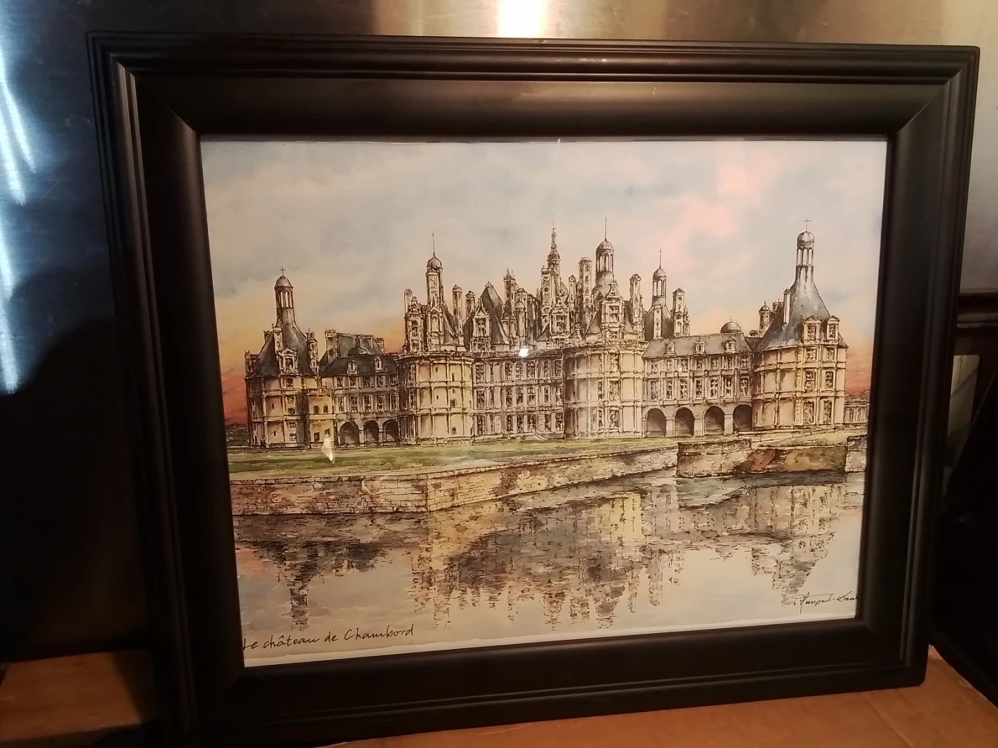 Capture the allure of French Renaissance architecture with this framed Le Château de Chambord print, signed by the artist, sized at 17.25x14.25 inches. The print showcases the stunning castle with its reflection shimmering in the water, bringing a touch of European elegance to any room. This piece is in good condition, ready to adorn your wall and spark conversations.