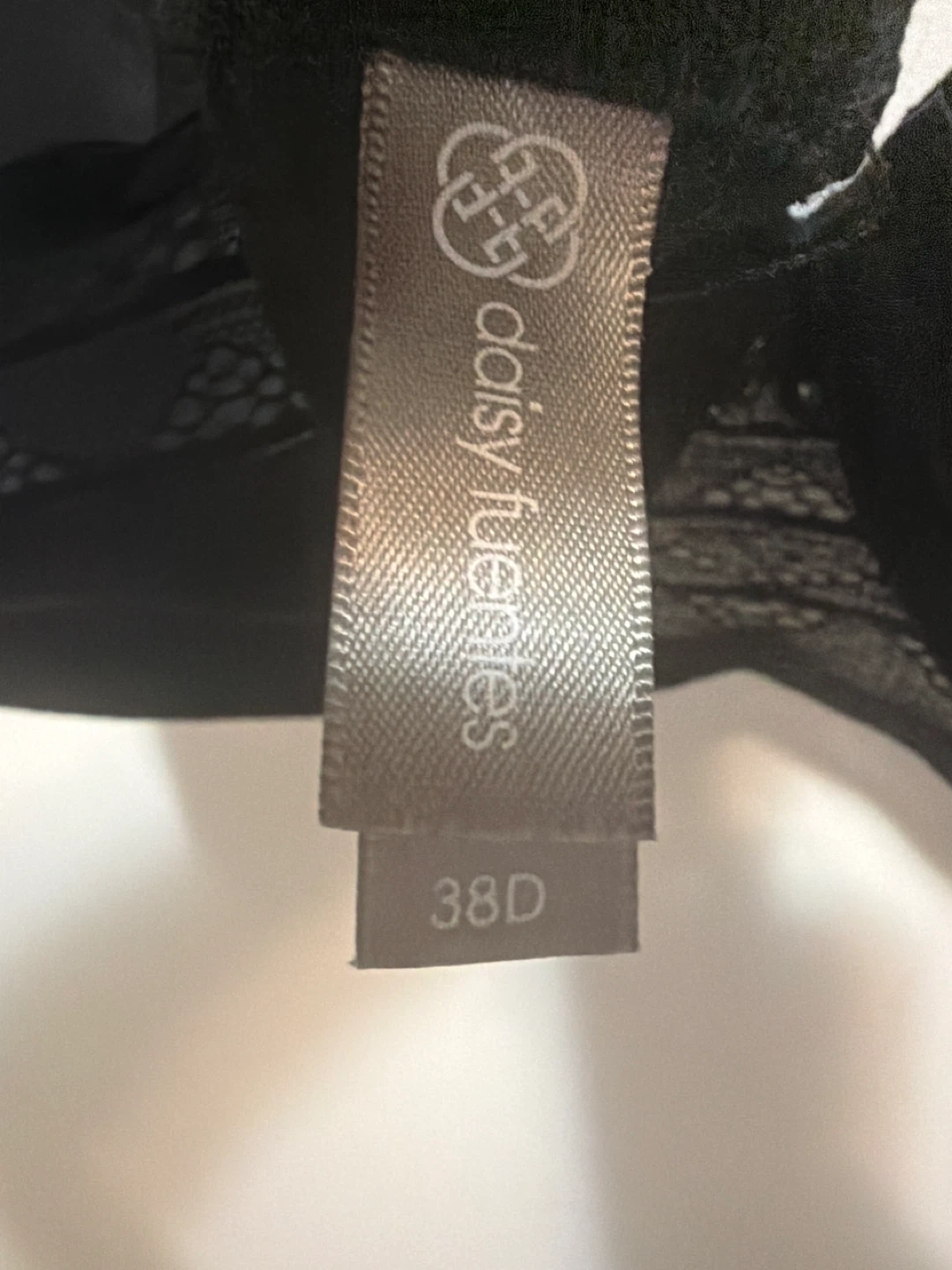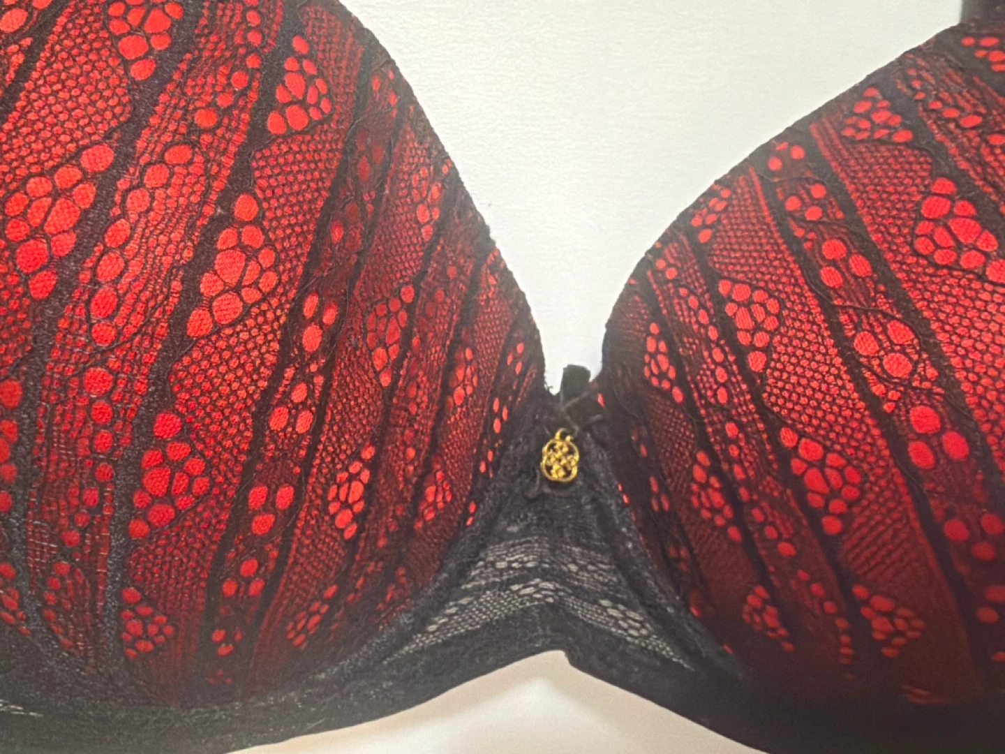 This Daisy Fuentes bra features a striking red lace overlay with black accents. It's a size 38D. Offers a stylish and supportive design.