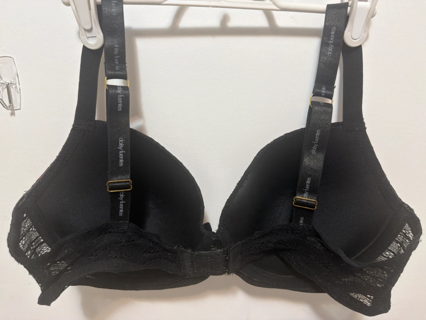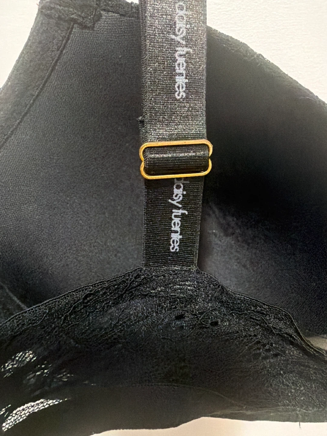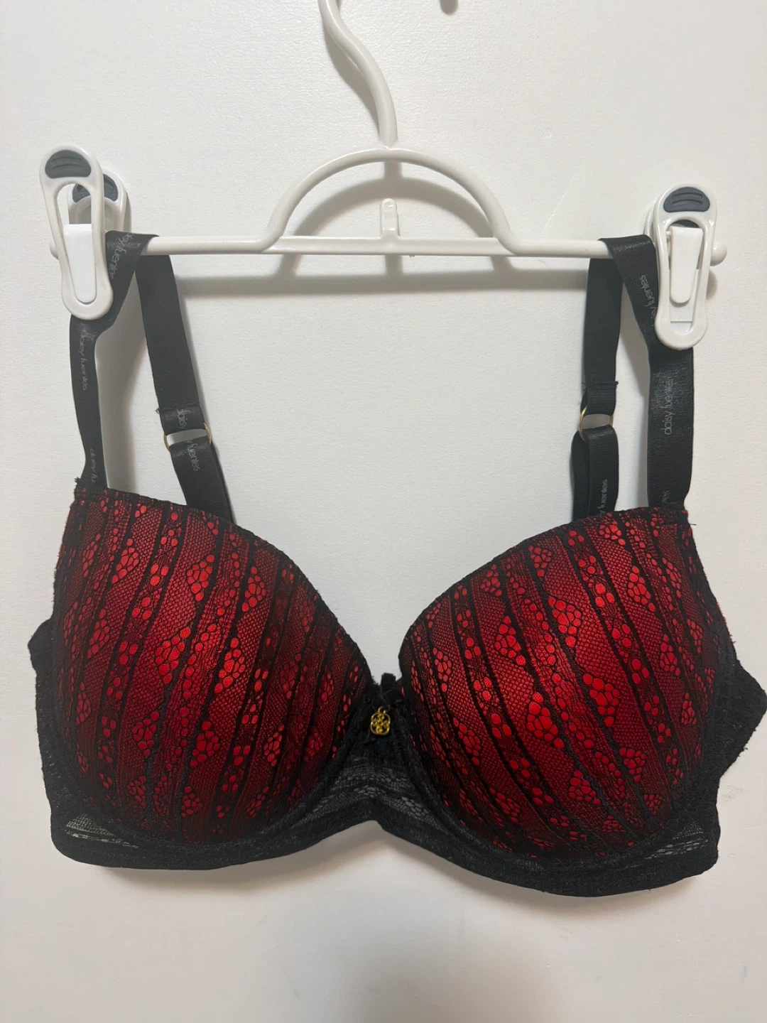 This Daisy Fuentes bra features a striking red lace overlay with black accents. It's a size 38D. Offers a stylish and supportive design.