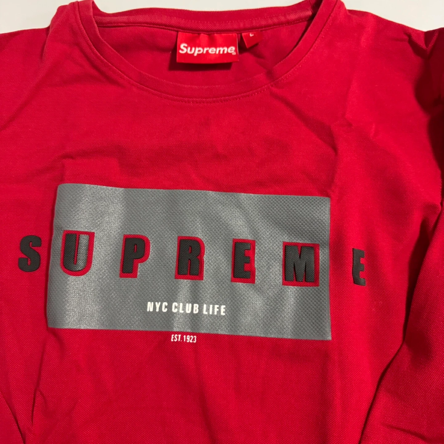Supreme red t-shirt with "NYC CLUB LIFE EST. 1923" graphic. Made from 100% pre-shrunk cotton. Crafted in Canada. This shirt is a great addition to any streetwear collection.