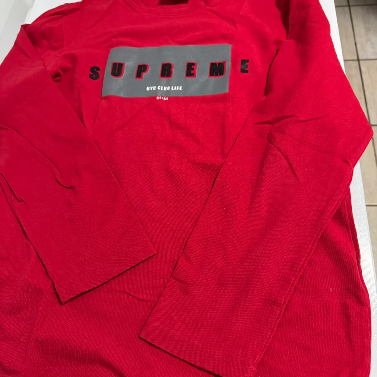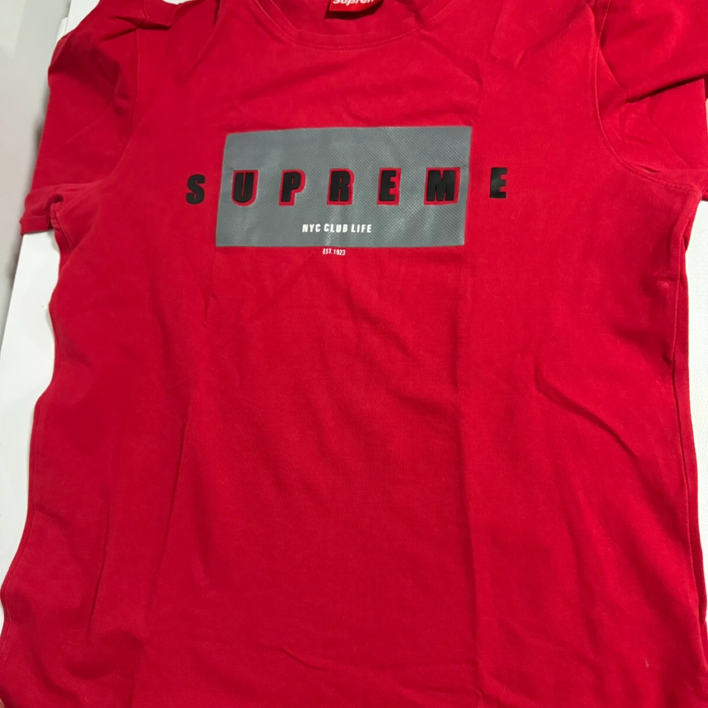 Supreme red t-shirt with "NYC CLUB LIFE EST. 1923" graphic. Made from 100% pre-shrunk cotton. Crafted in Canada. This shirt is a great addition to any streetwear collection.