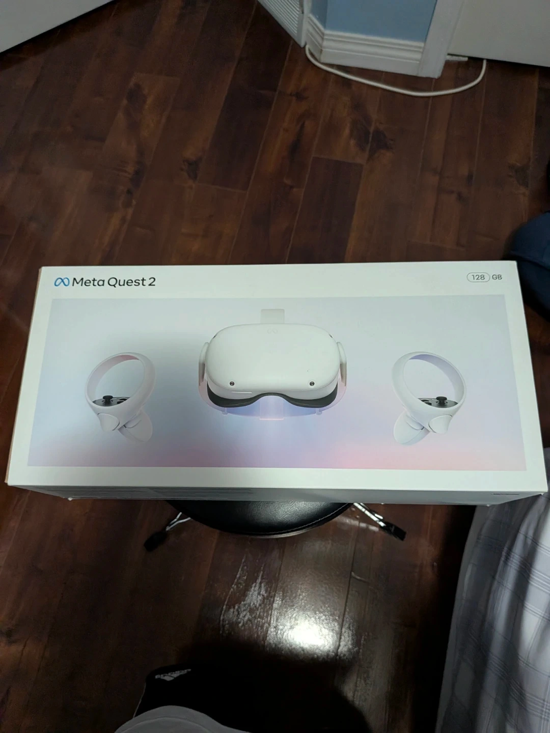 Meta Quest 2 VR headset and controllers with 128GB storage. Comes with original box and packaging. Includes headset, two controllers, and charging accessories.