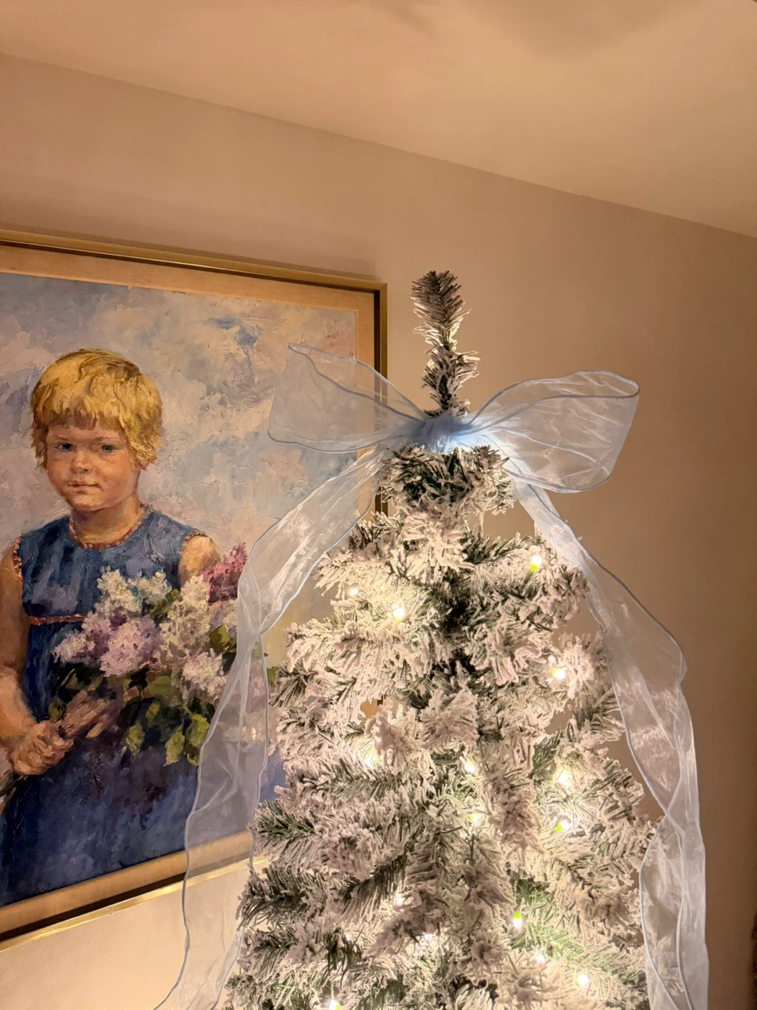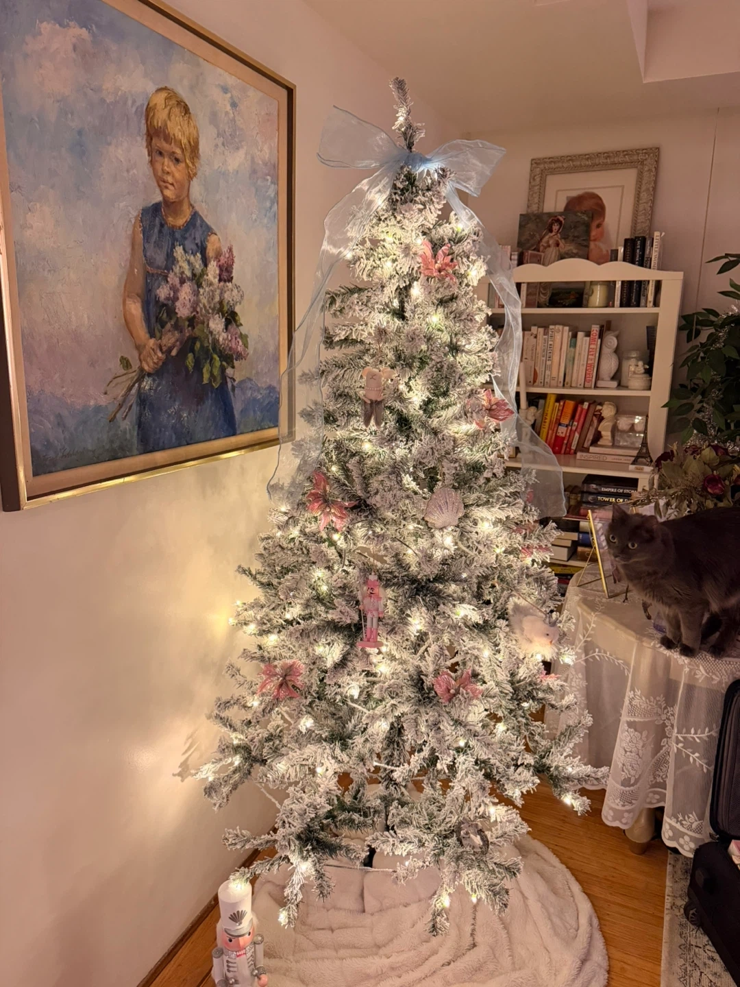 Selling a lovely Christmas tree that's all ready to go! It comes with the lights and so it's super easy to set up and enjoy. Unfortunately selling because my cat (literally in the picture) keeps trying to eat it. Brand new. Just set up for a couple days