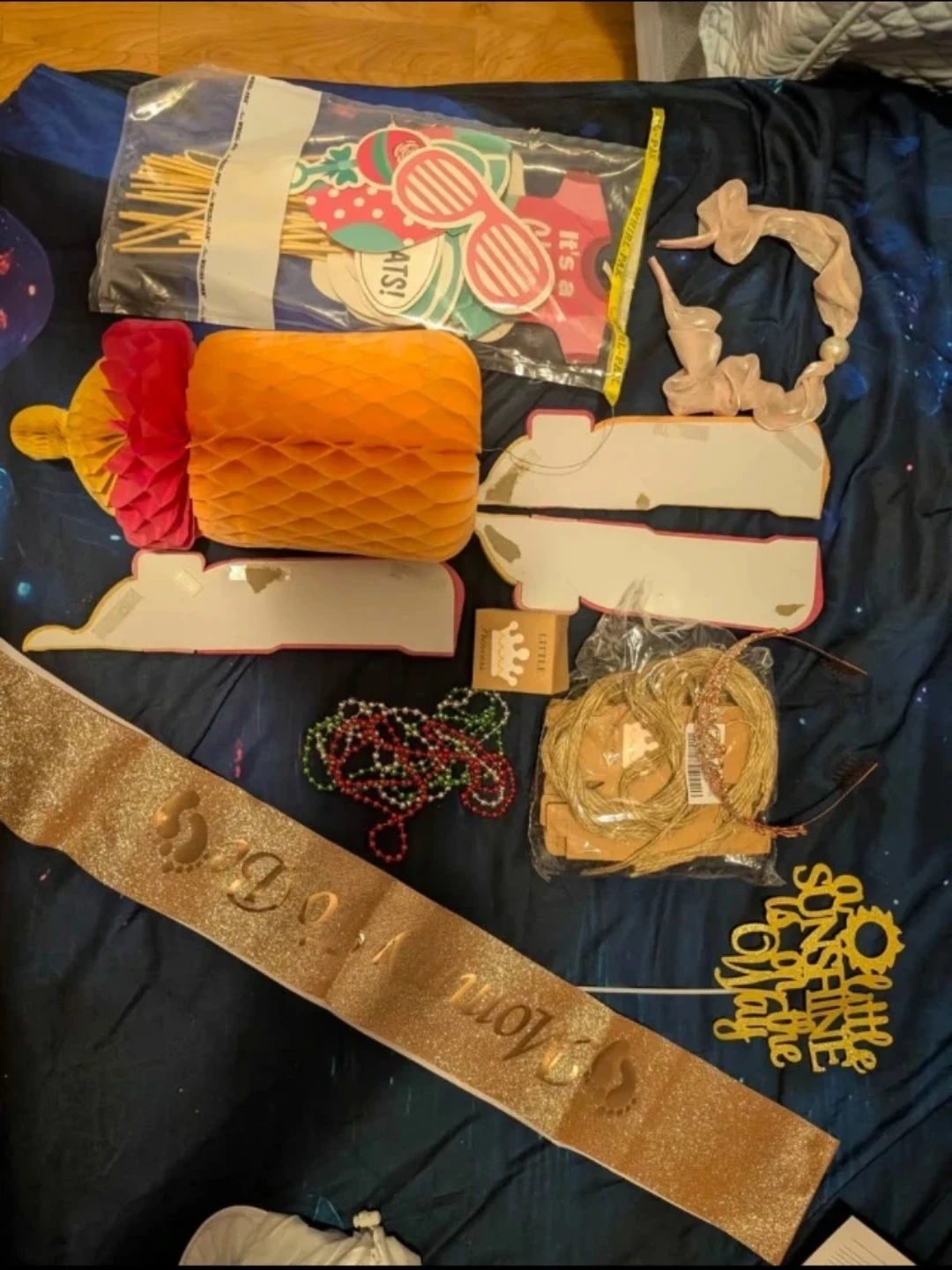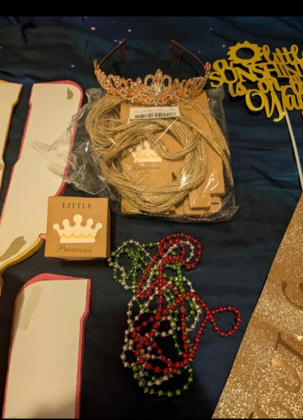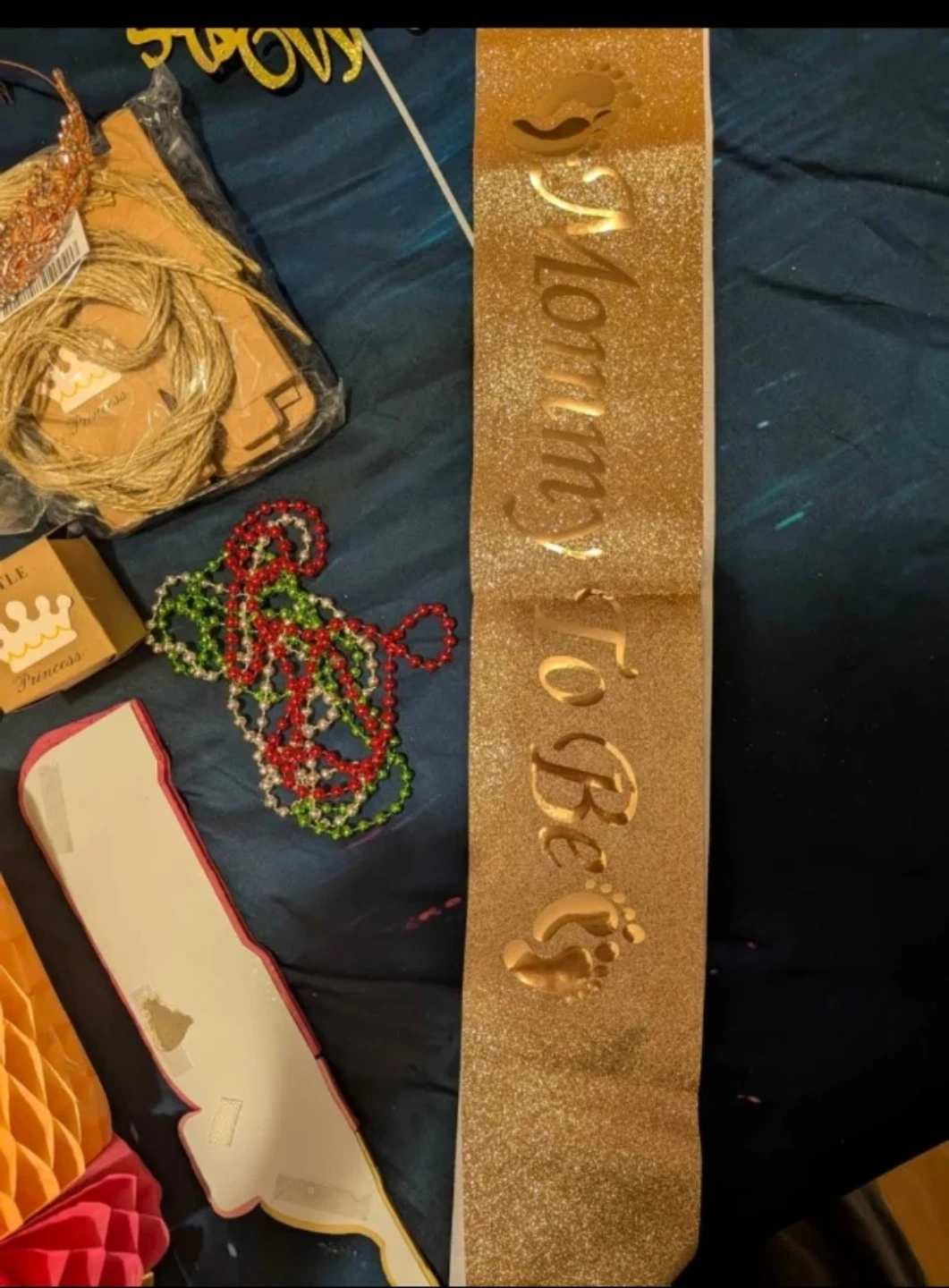 This bundle includes decorations for a baby shower, featuring a 'Mommy to Be' sash and a princess tiara. It also comes with photo booth props, beaded necklaces, and other themed accents. Perfect for celebrating a new arrival!
