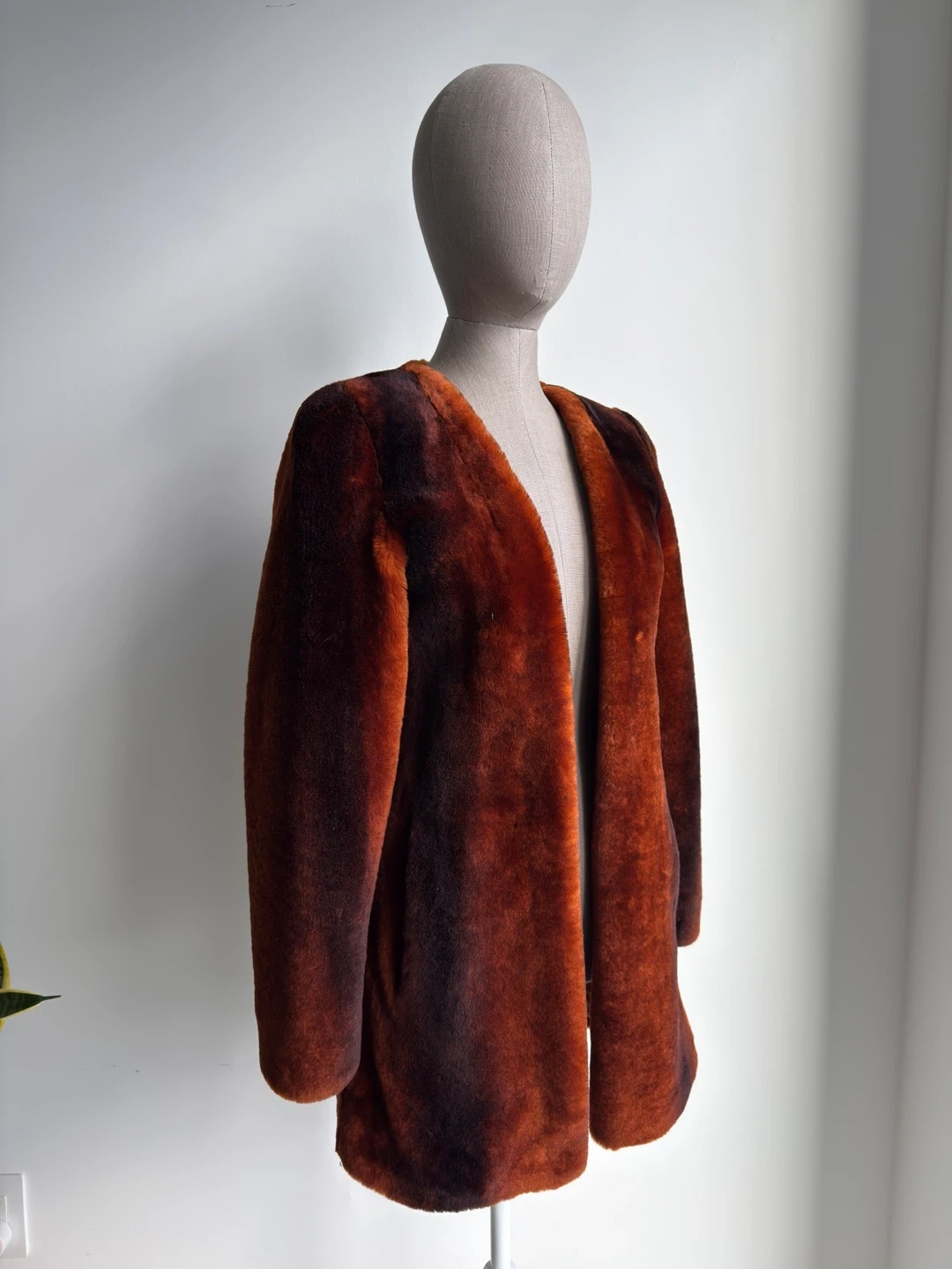 Warm and stylish faux fur coat in a rich ombre brown. It's got an open front design. Great for adding a touch of flair to any outfit! Size 44.