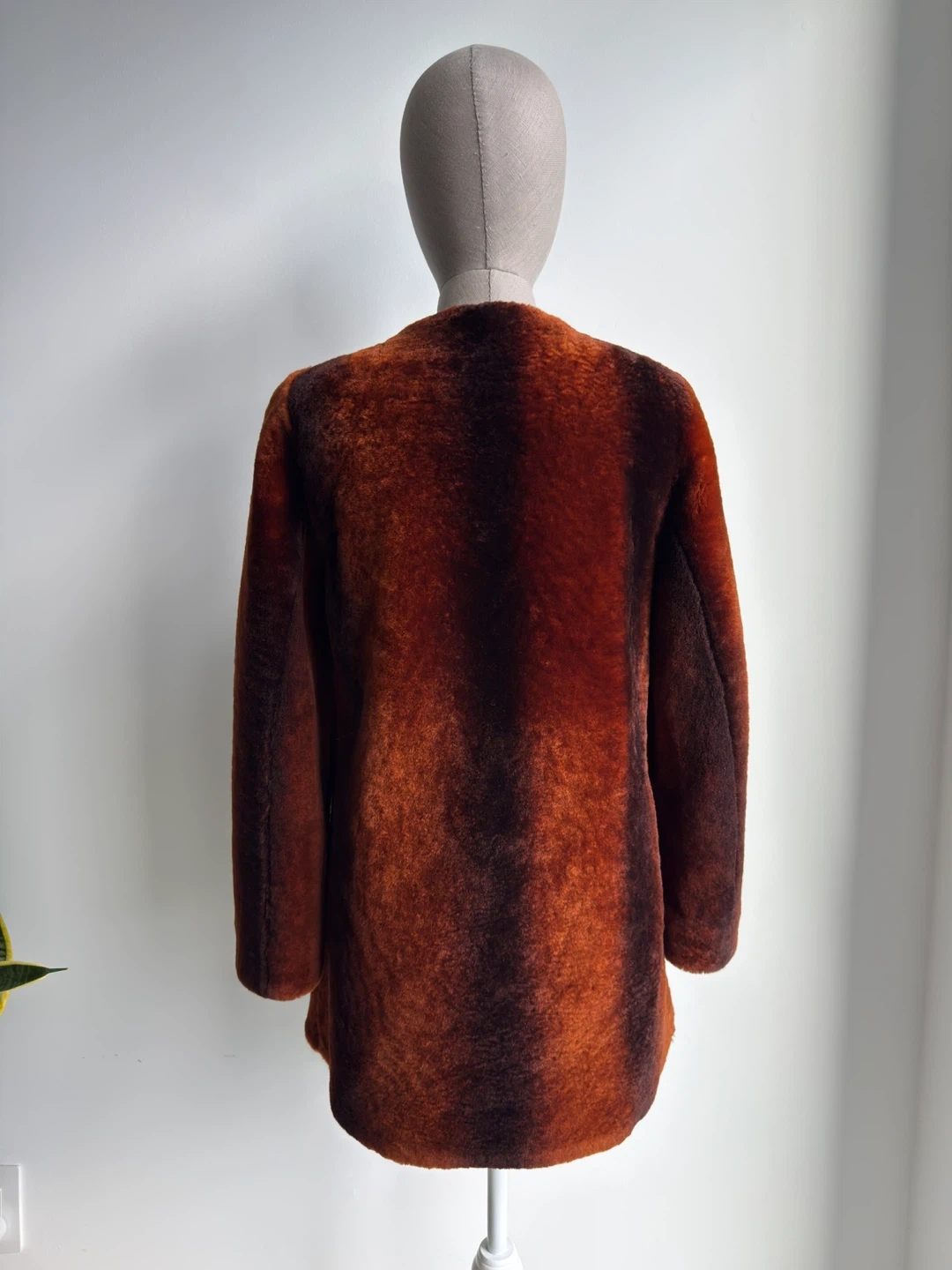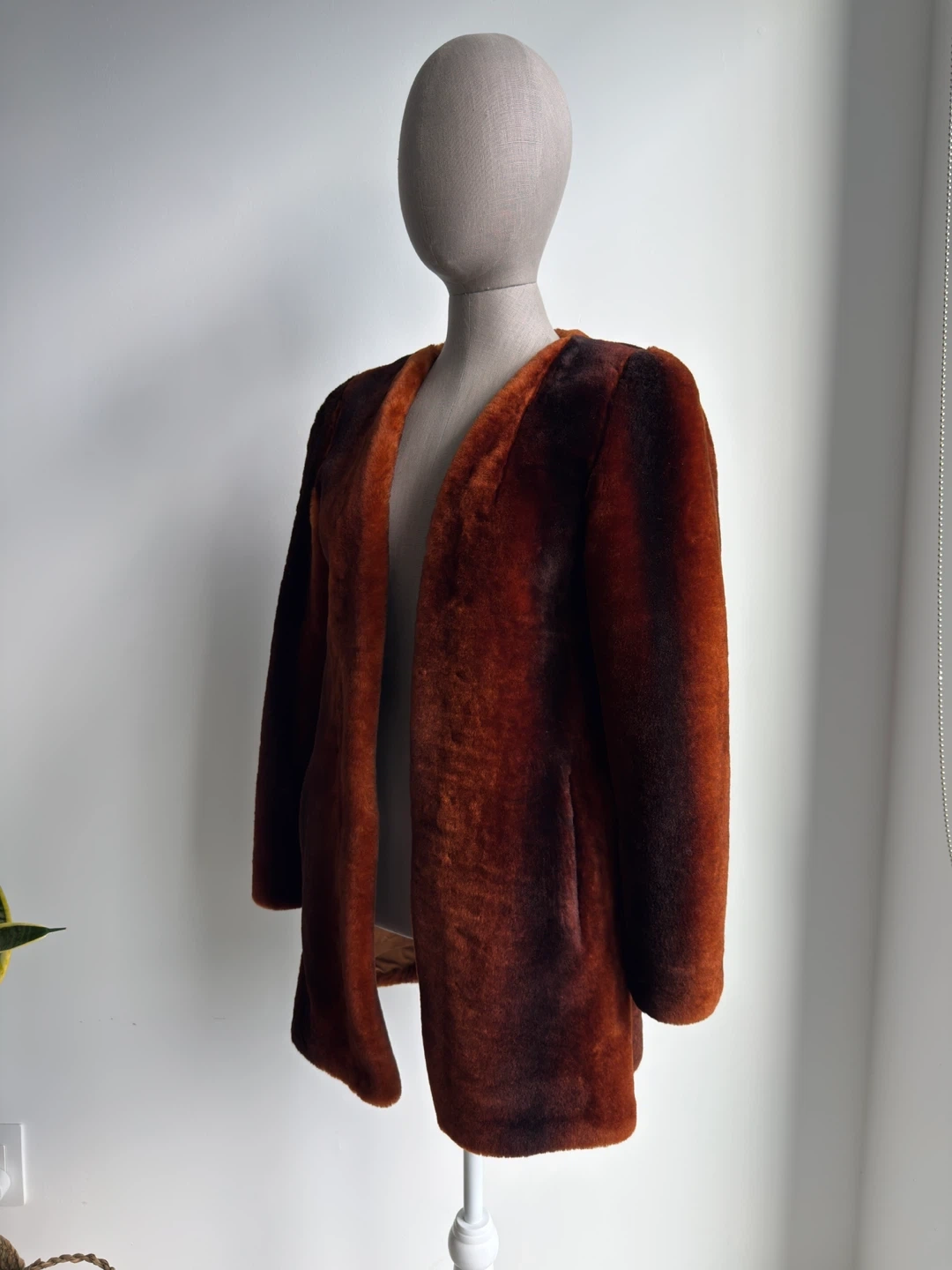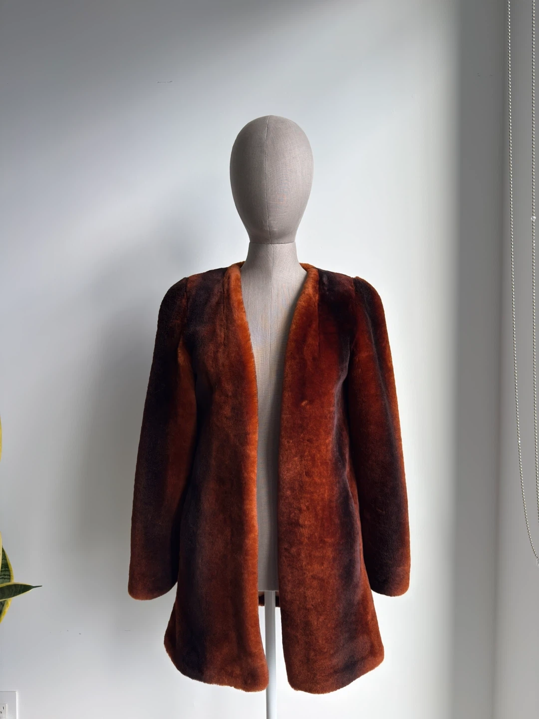 Warm and stylish faux fur coat in a rich ombre brown. It's got an open front design. Great for adding a touch of flair to any outfit! Size 44.