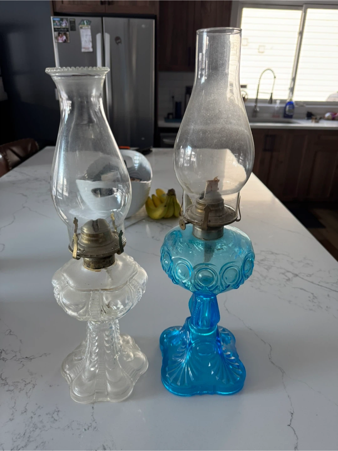 This listing includes two decorative oil lamps, one clear and one blue. Both have glass chimneys and ornate bases. They're perfect for adding a touch of vintage charm to your home decor. The price is for the pair.