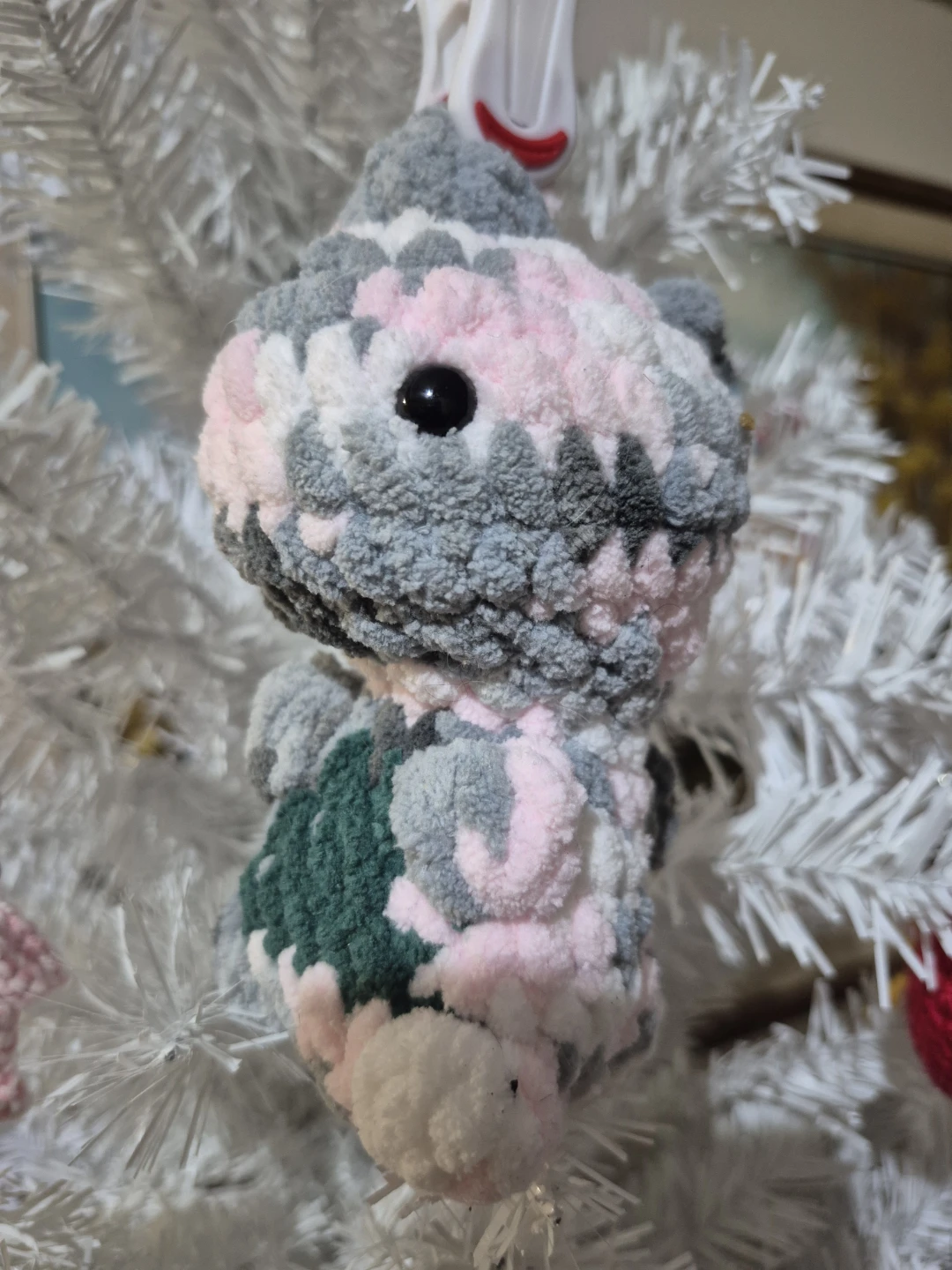 This is a cute, handmade crochet plush toy. It's made with soft, fuzzy yarn in a camouflage pattern of grey, pink, and white. Its small size makes it a great desk buddy or a fun little gift!
