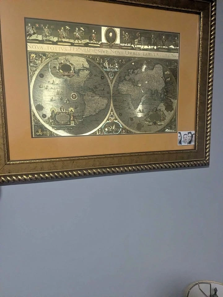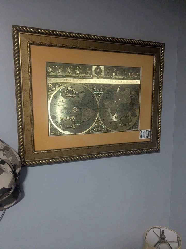 Beautiful, large-scale gold foil reproduction of the famous 1665 world map by Dutch cartographer Willem Blaeu. This is a high-quality vintage piece with stunning detail and a brilliant gold reflective finish. Subject: Map of the World (Nova Totius Terrarum Orbis Geographica ac Hydrographica Tabula). Features ornate illustrations of the four seasons, celestial bodies, and the seven wonders of the ancient world. Excellent vintage condition. The gold foil is intact with no flaking or fading. Comes in a solid, high-quality vintage frame [insert frame color/material here, e.g., dark walnut or ornate gold]. Perfect for an office, library, or as a unique statement piece for your home decor. Price: $175 (OBO). Location: Welland/Port Colborne Area.