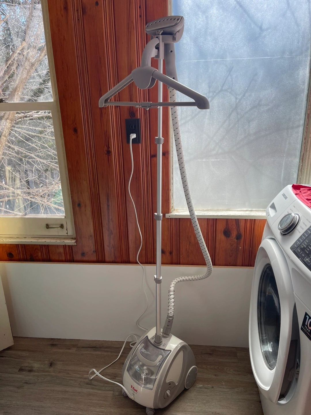 Vertical garment steamer. Includes a hanging rack. Good for quick wrinkle removal.
