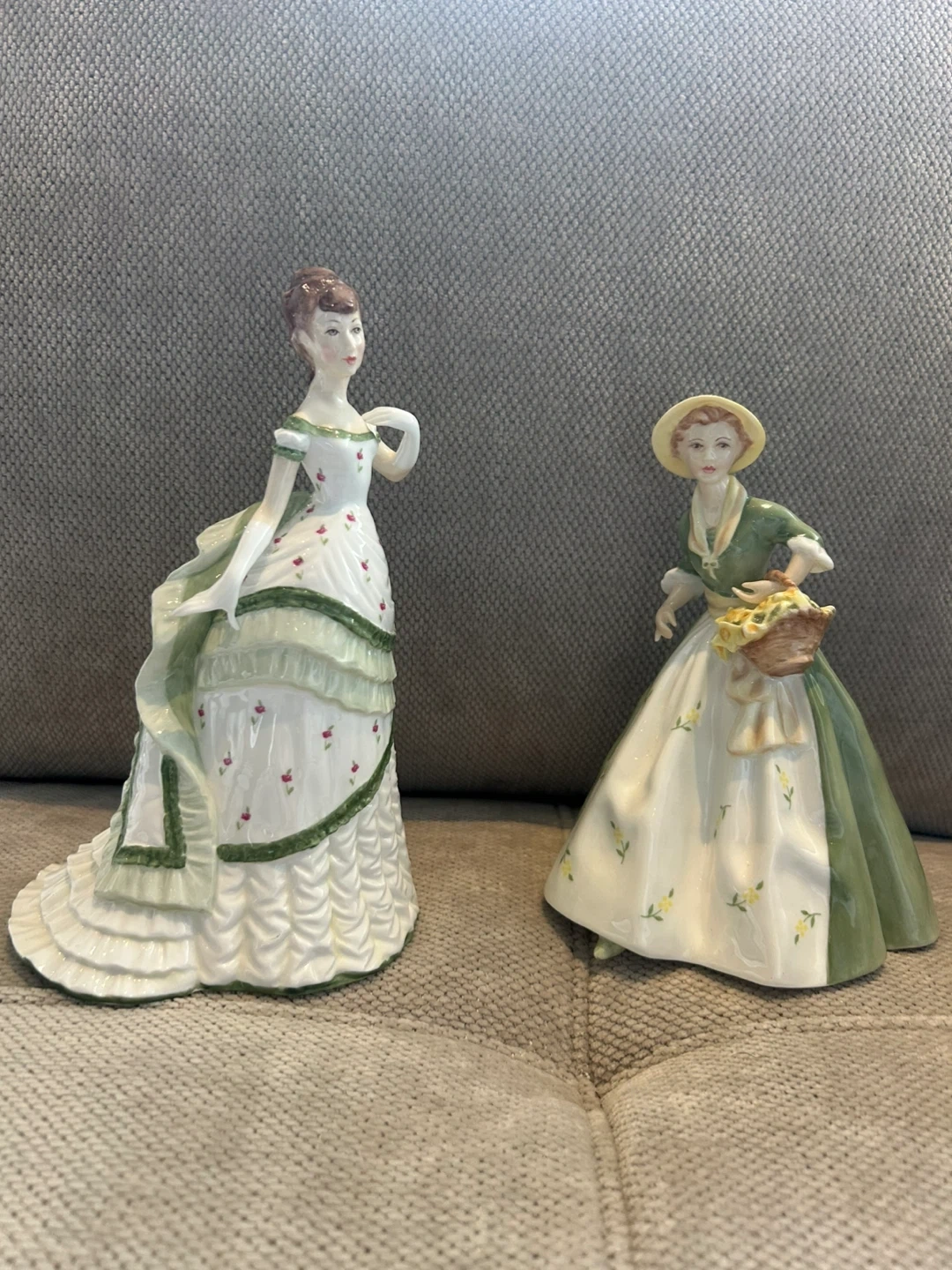 These are two lovely porcelain figurines depicting ladies in vintage attire. One is adorned with red floral accents and intricate ruffles, while the other carries a basket and wears a straw hat. They're made of porcelain and feature delicate hand-painted details. Adds a touch of elegance to any display! 30$ each