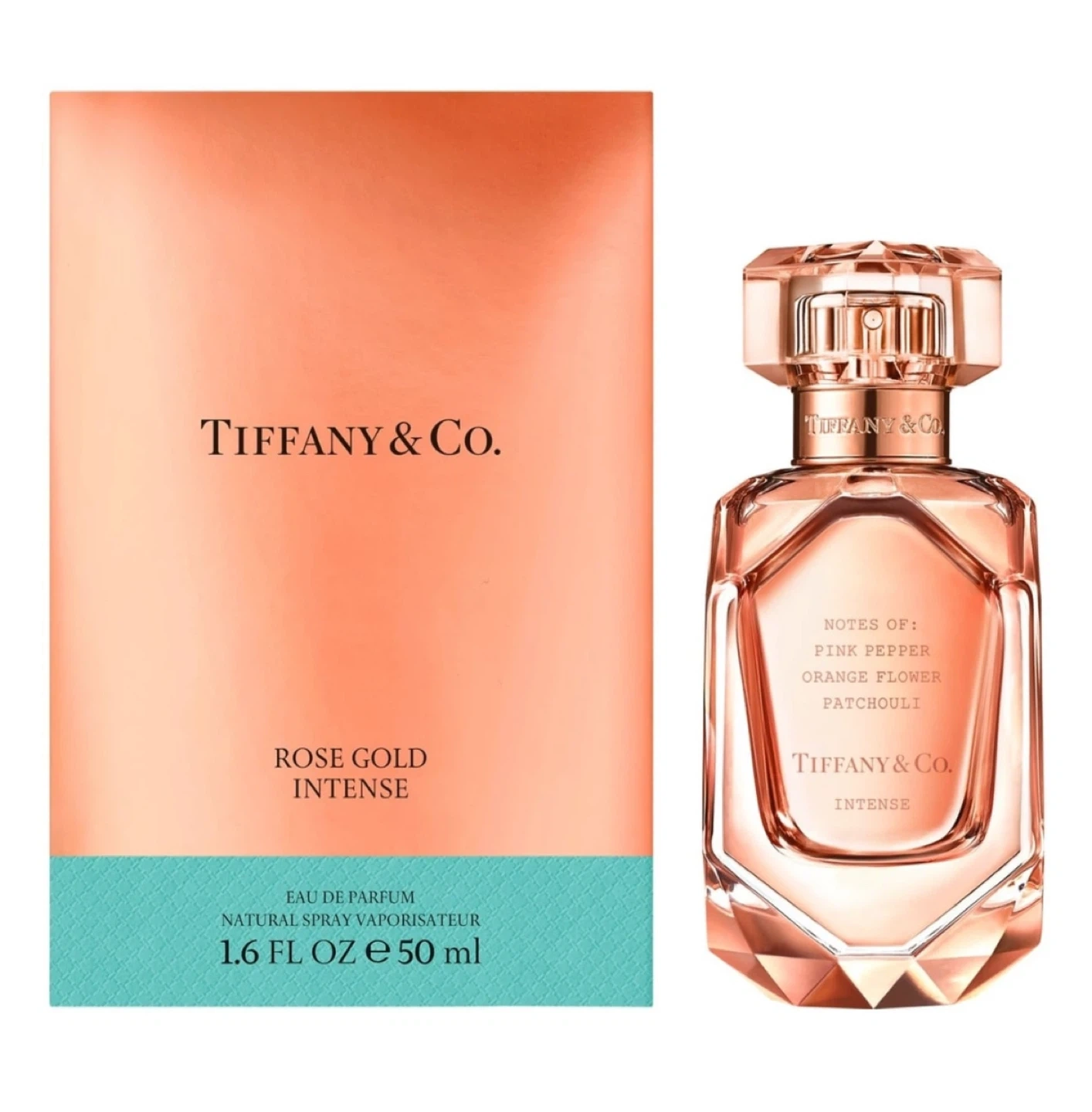 This is Tiffany & Co. Rose Gold Intense Eau de Parfum. It's a natural spray vaporisateur. Notes include pink pepper, orange flower, and patchouli.