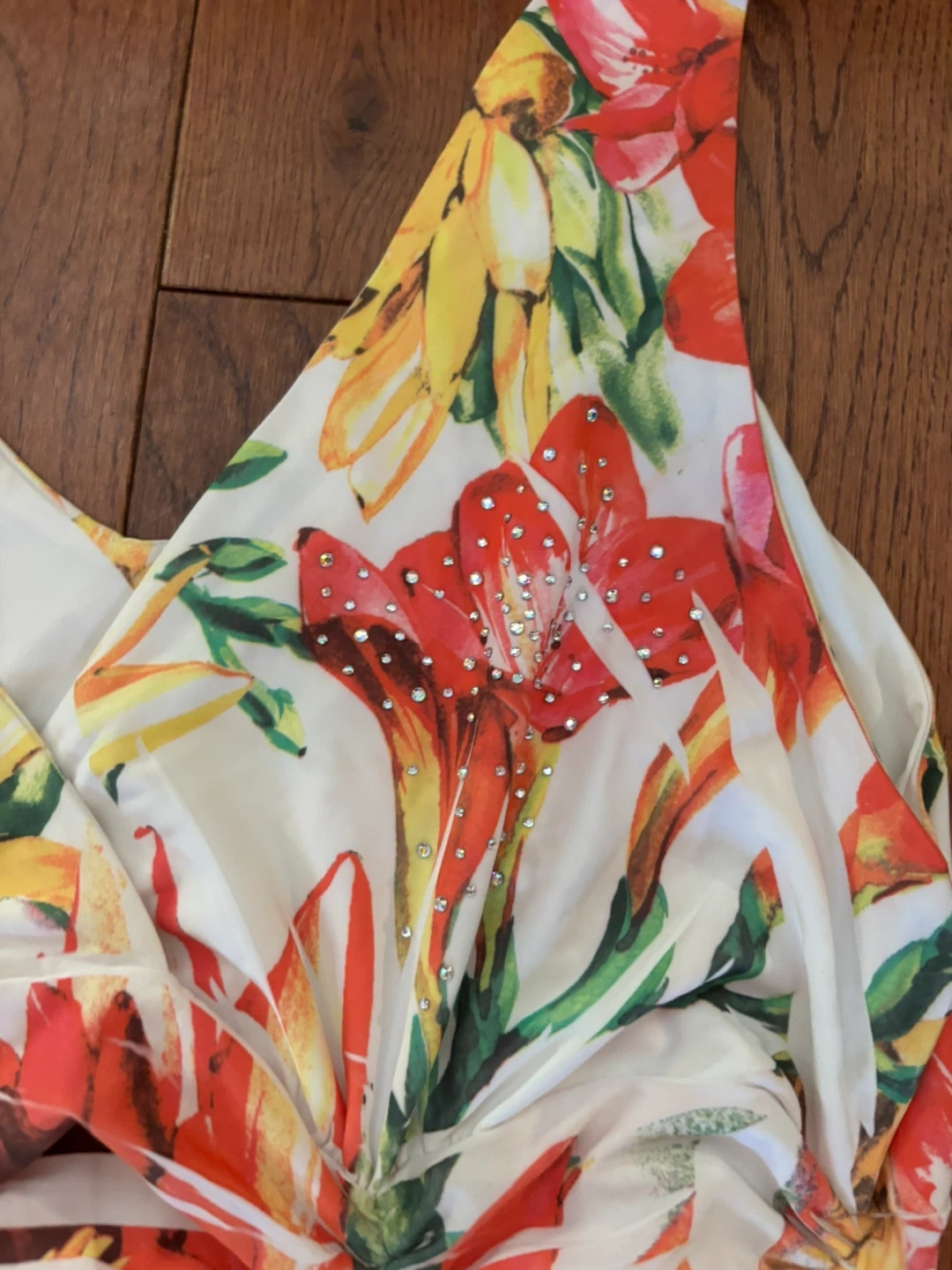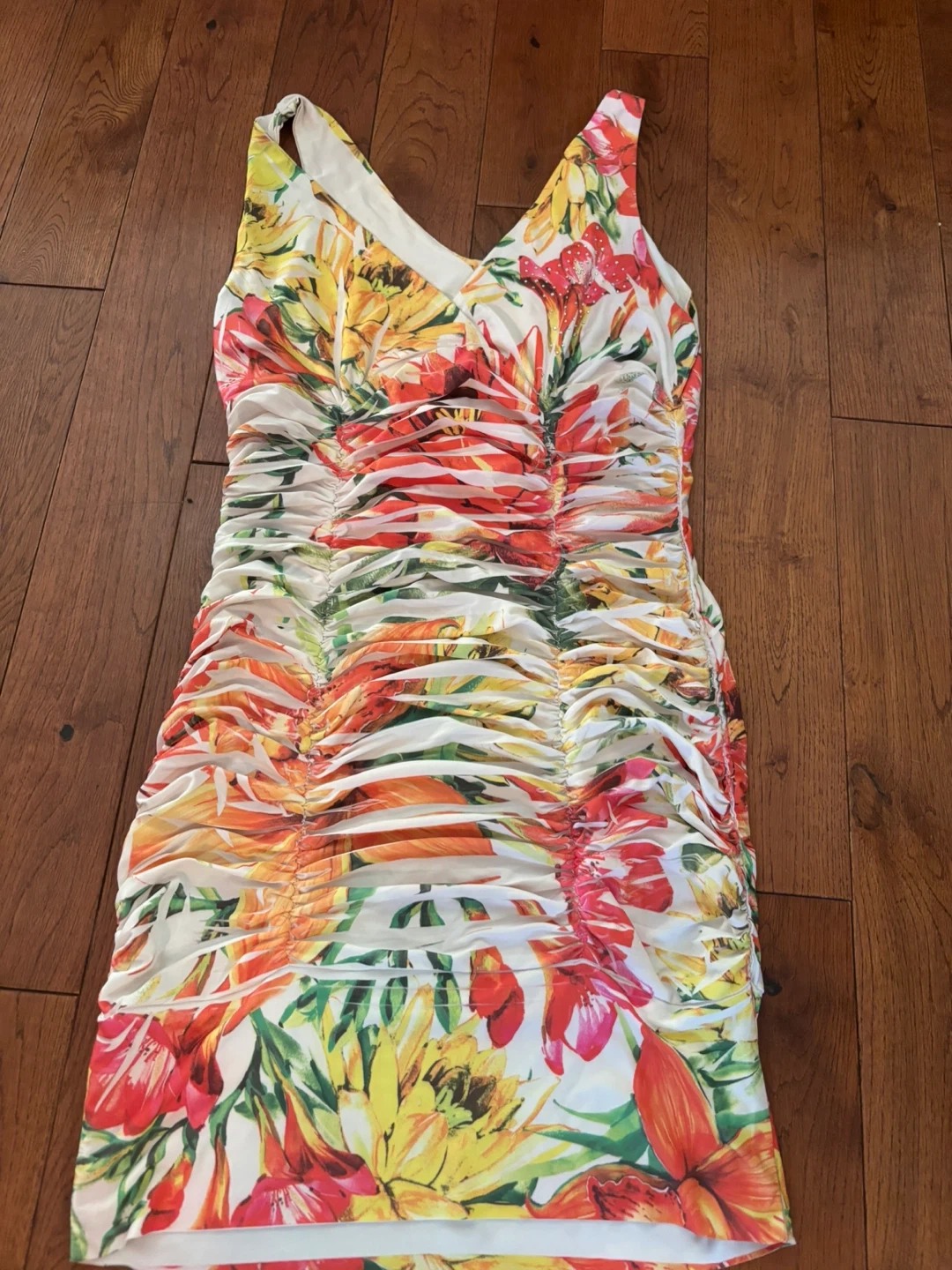 This sleeveless dress features a vibrant floral print with eye-catching ruching along the sides. It has a flattering V-neckline and a comfortable, form-fitting silhouette. A great option for a summer outing or a casual evening event! Size medium