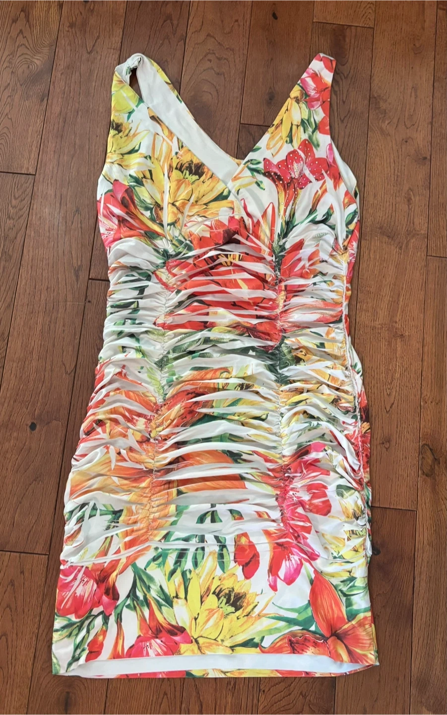 This sleeveless dress features a vibrant floral print with eye-catching ruching along the sides. It has a flattering V-neckline and a comfortable, form-fitting silhouette. A great option for a summer outing or a casual evening event! Size medium