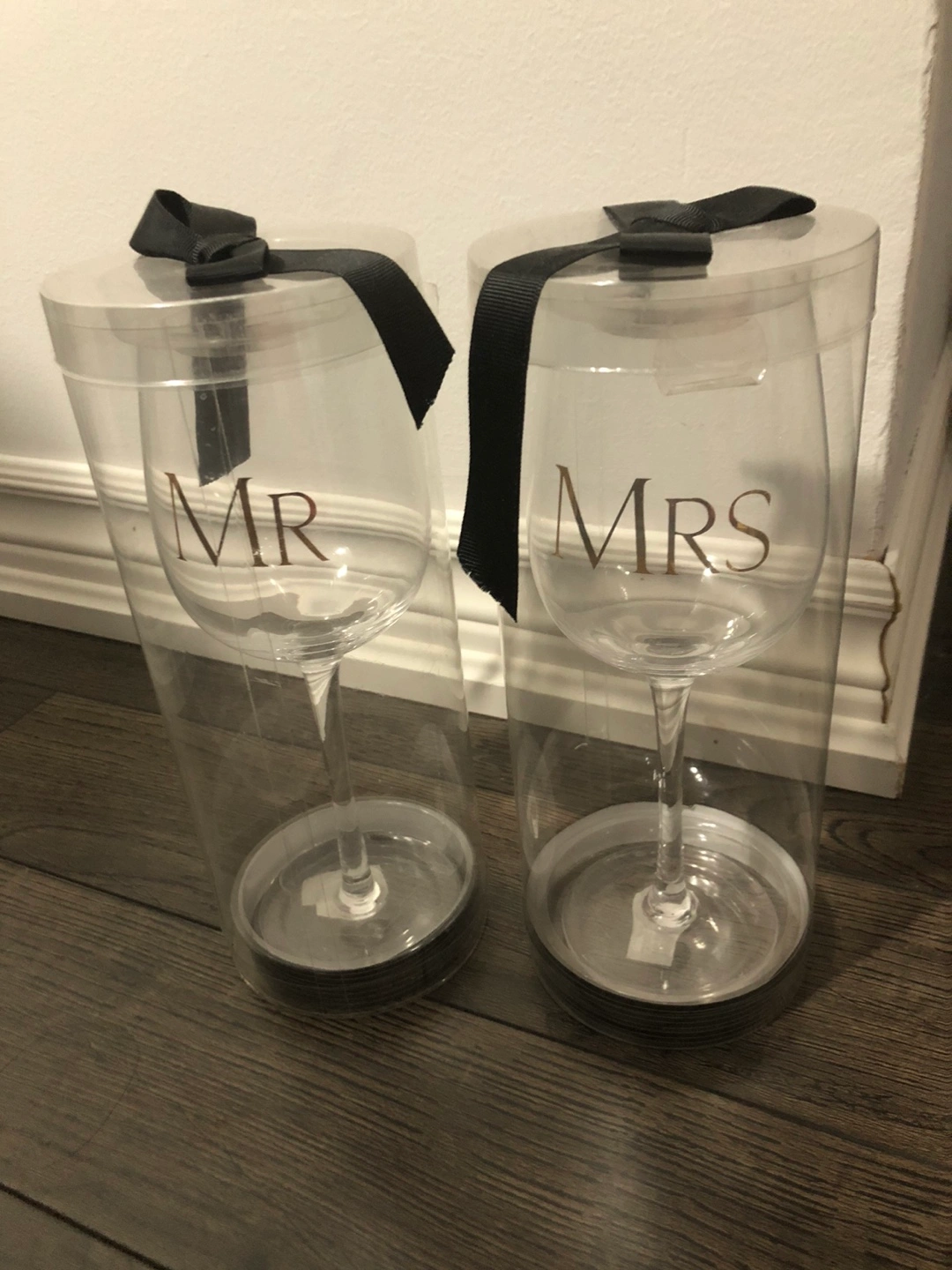 Set of two wine glasses. One says Mr. and the other says Mrs. They are in their original packaging from Hallmark Canada.