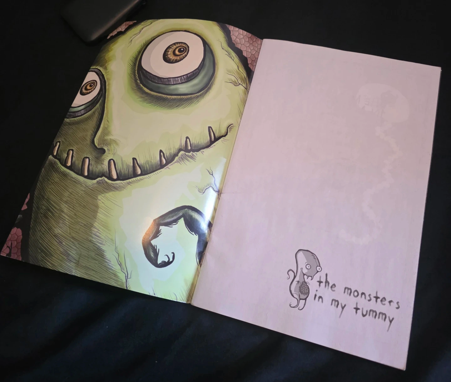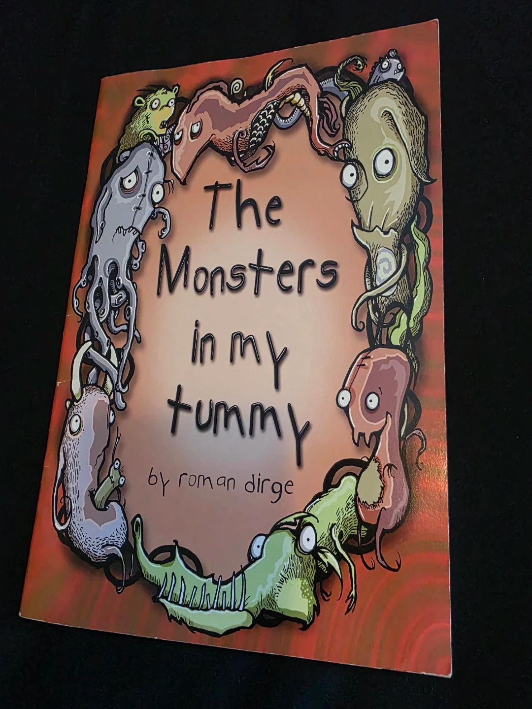 'The Monsters in my Tummy' book by Roman Dirge. It features dark and whimsical illustrations. The book is a collection of poems and art.
