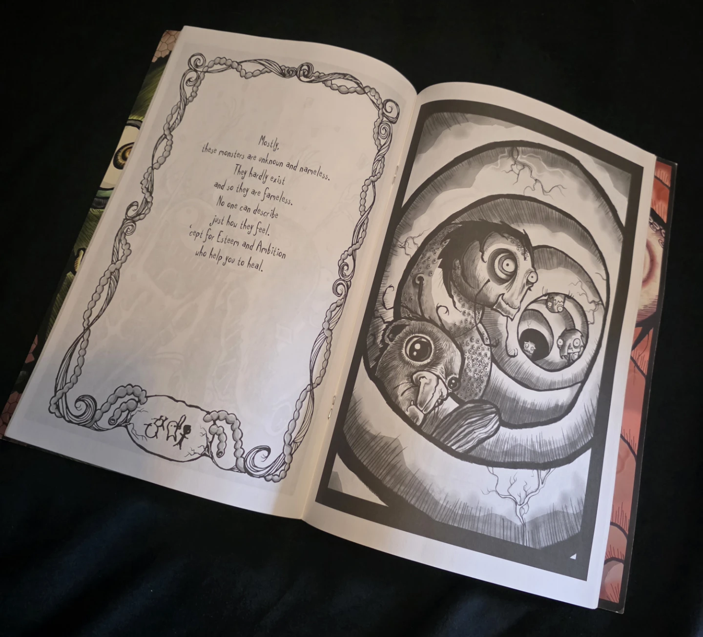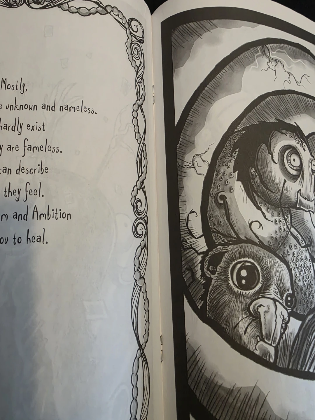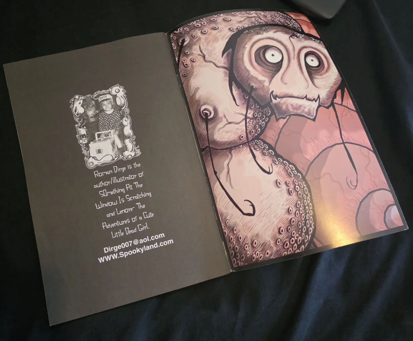 'The Monsters in my Tummy' book by Roman Dirge. It features dark and whimsical illustrations. The book is a collection of poems and art.
