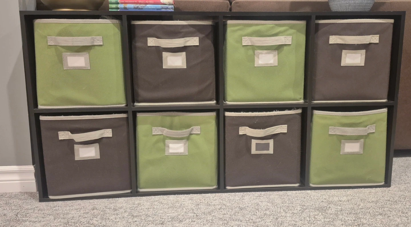 This storage cube organizer comes with eight fabric bins, four in a light green and four in a dark brown. It's a great way to keep your living space tidy. The bins have pull tabs for easy access. Perfect for organizing toys, books, or other household items.