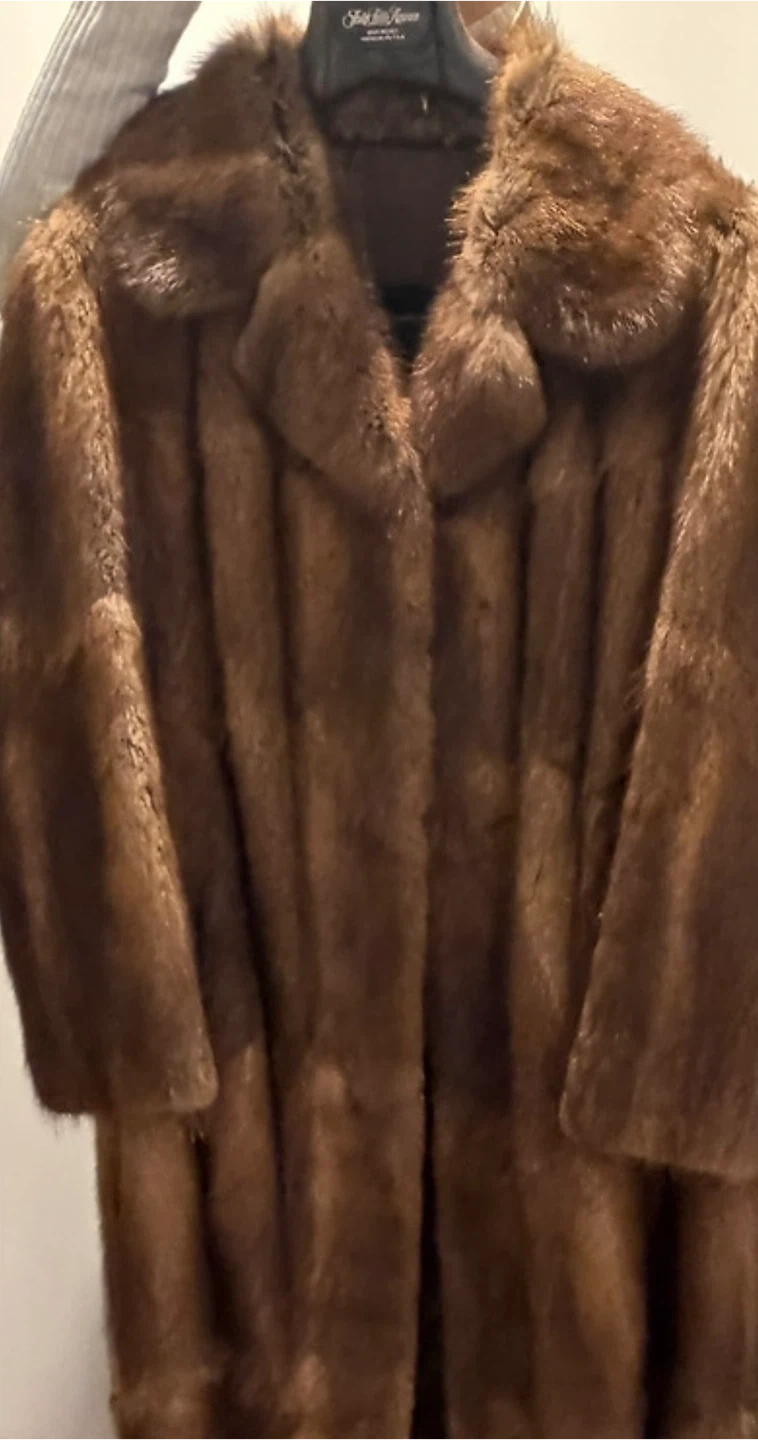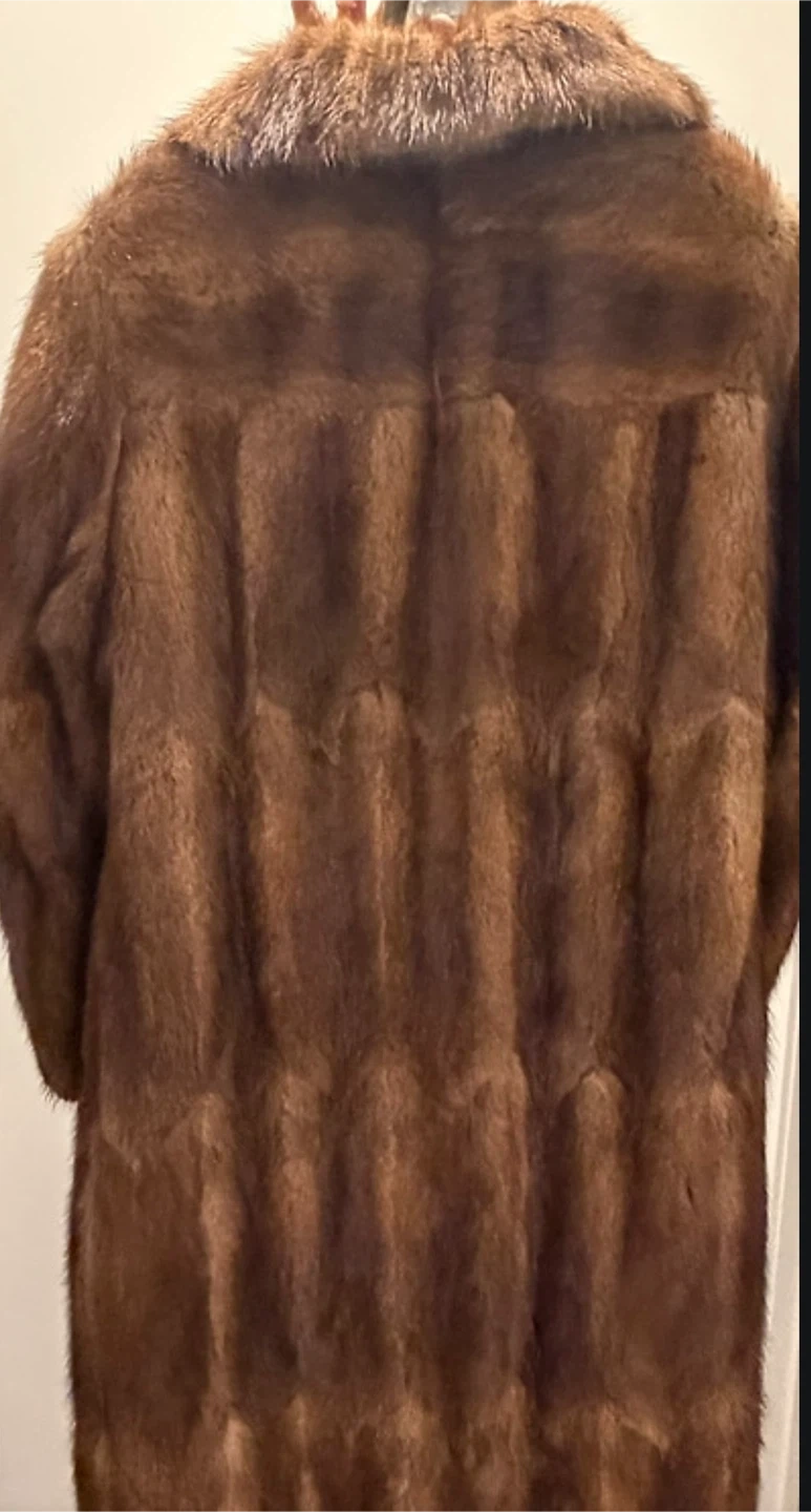 Luxurious brown mink fur coat with a classic collar. This elegant outerwear is made from genuine mink fur. It's a stylish choice for keeping warm.