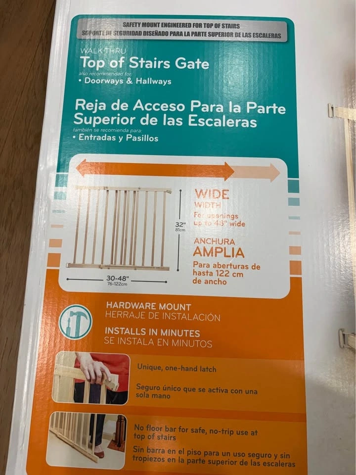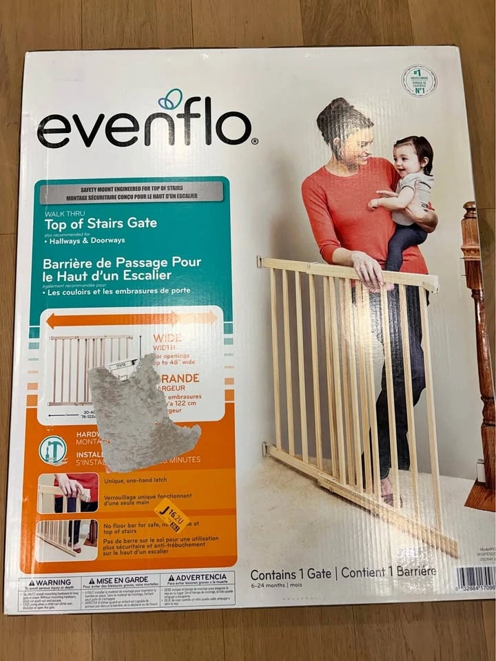 New Evenflo baby gate. Hardware mount walk thru gate for top of stairs, hallways, doorways. Fits openings 30-48 inches wide, 32 inches tall. Purchased new and never used or opened. Pickup in Port Coquitlam only.