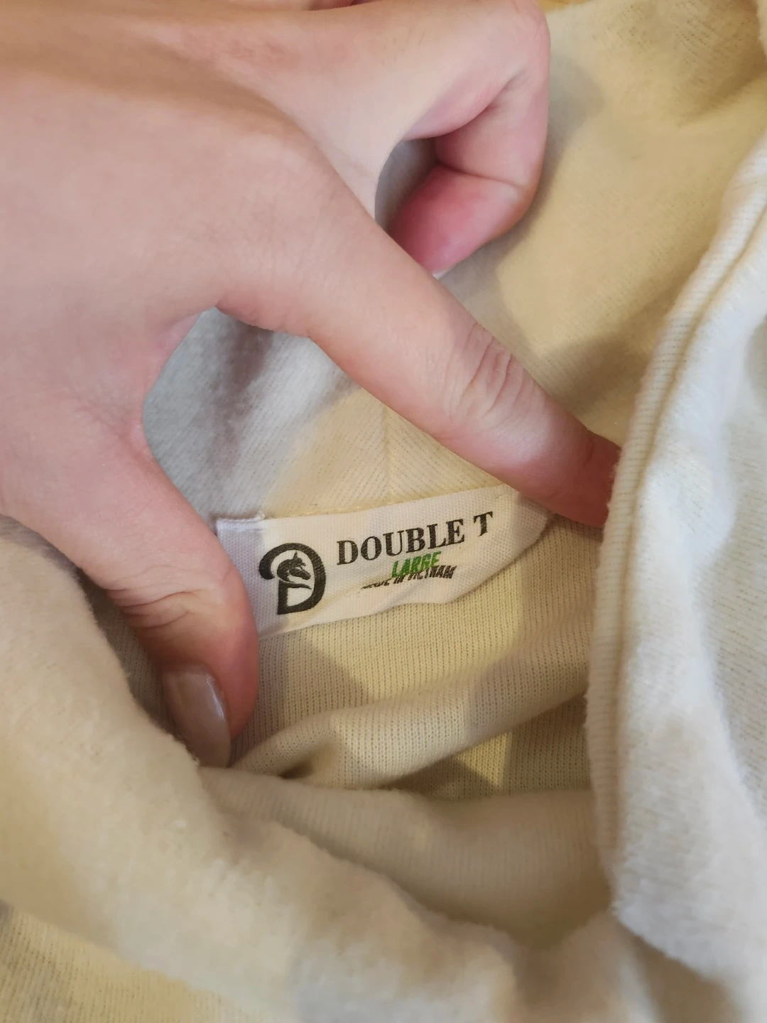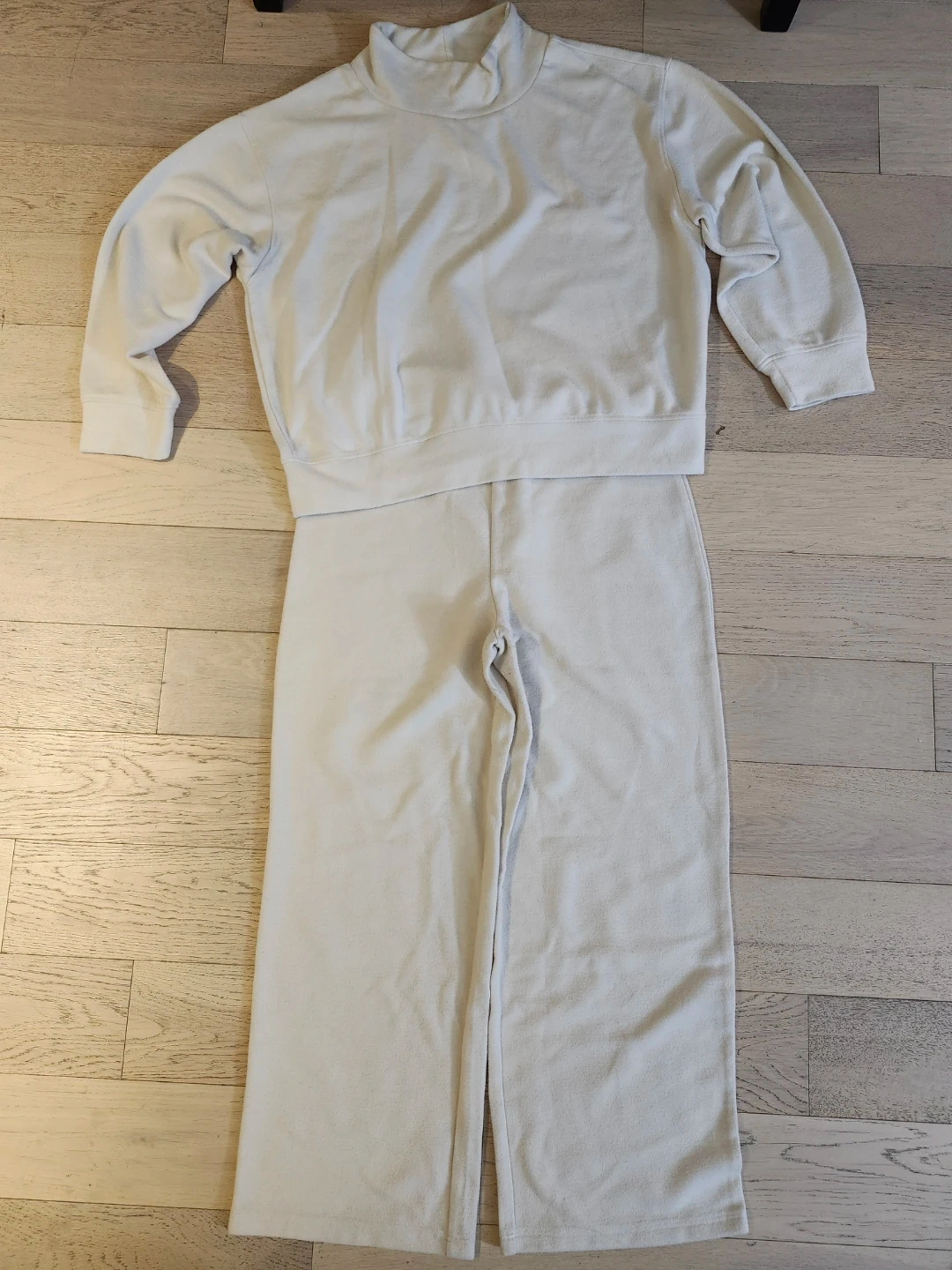 Cozy up with this Double T loungewear set in a lovely cream colour! The set includes a comfortable top and matching pants, both in size large. Perfect for relaxing at home or running errands in style
