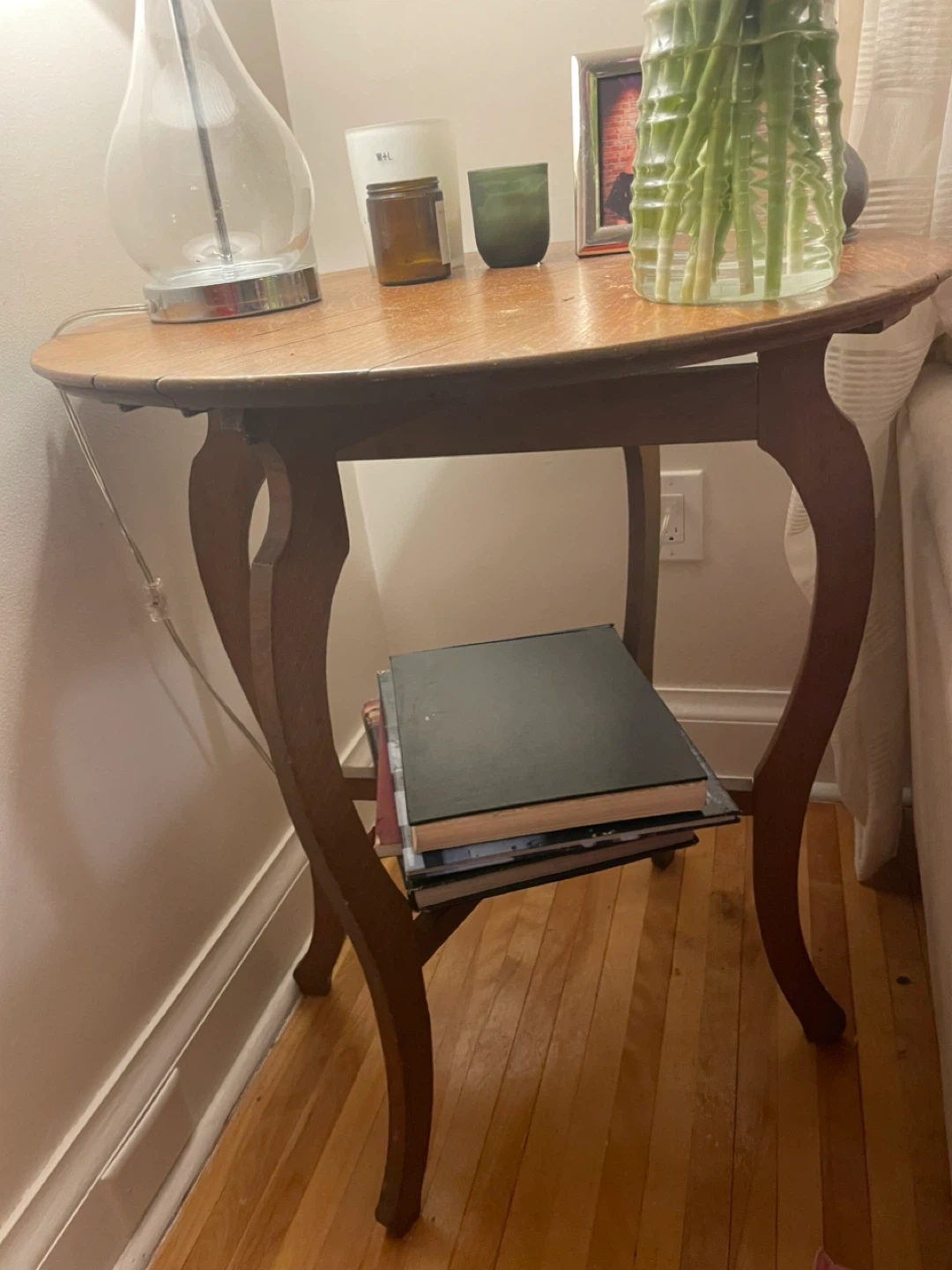 This is a charming vintage accent table made of wood. It features a drop-leaf design and curved legs, adding a touch of classic style to any room. A lower shelf offers extra storage space for books or decor. It's perfect for smaller spaces or as an entryway table!