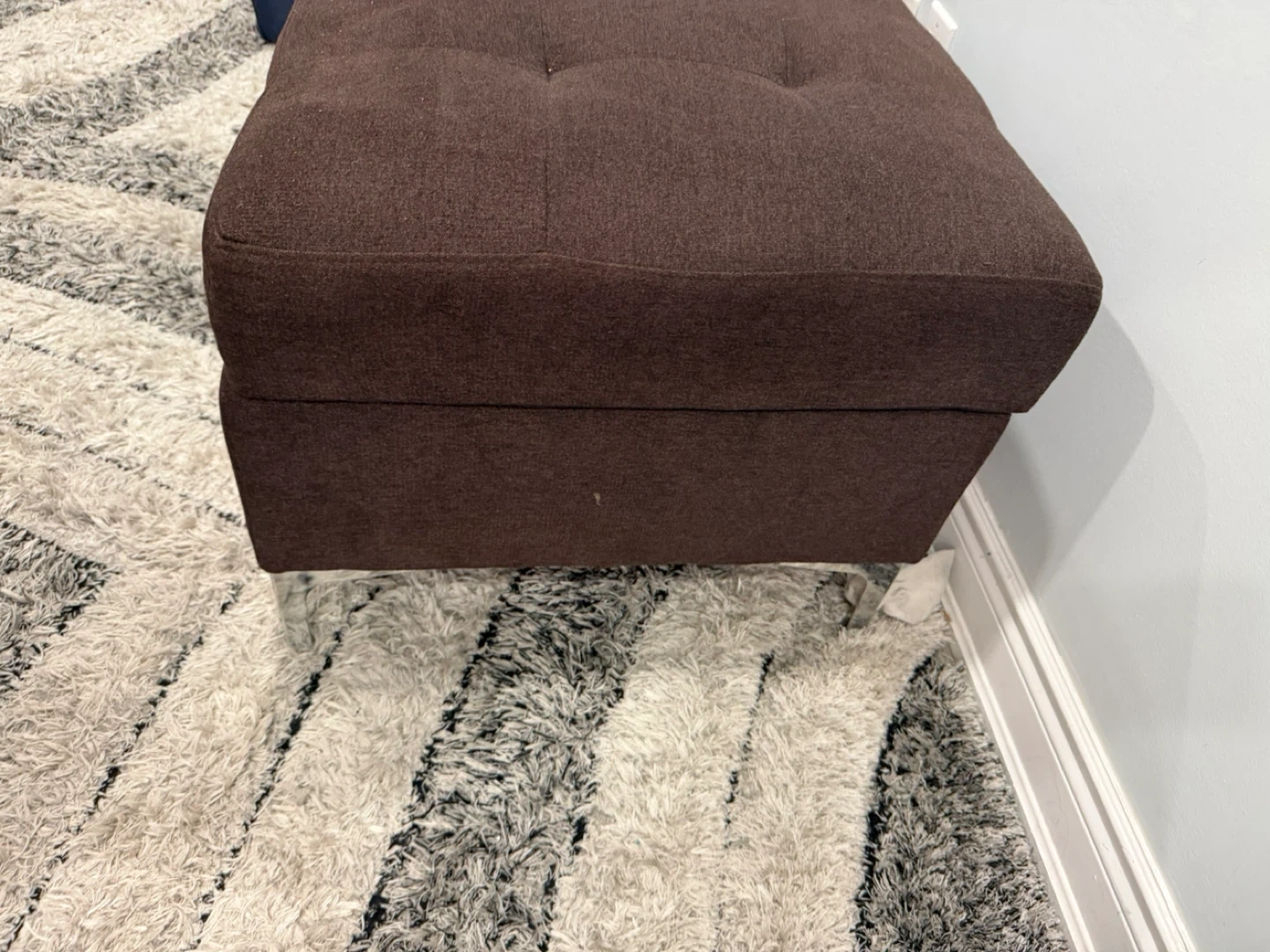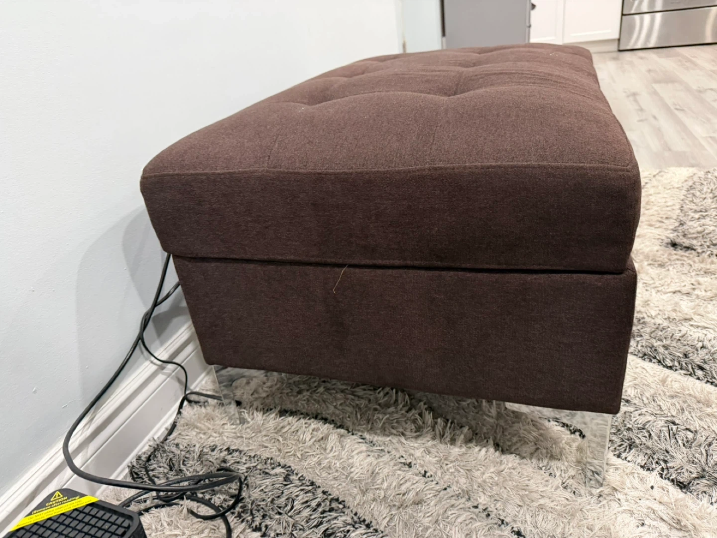 This ottoman features a tufted microfiber top and a hidden storage compartment. Its chocolate colour and versatile design make it a great addition to any room. Storage ottoman with lift-top.