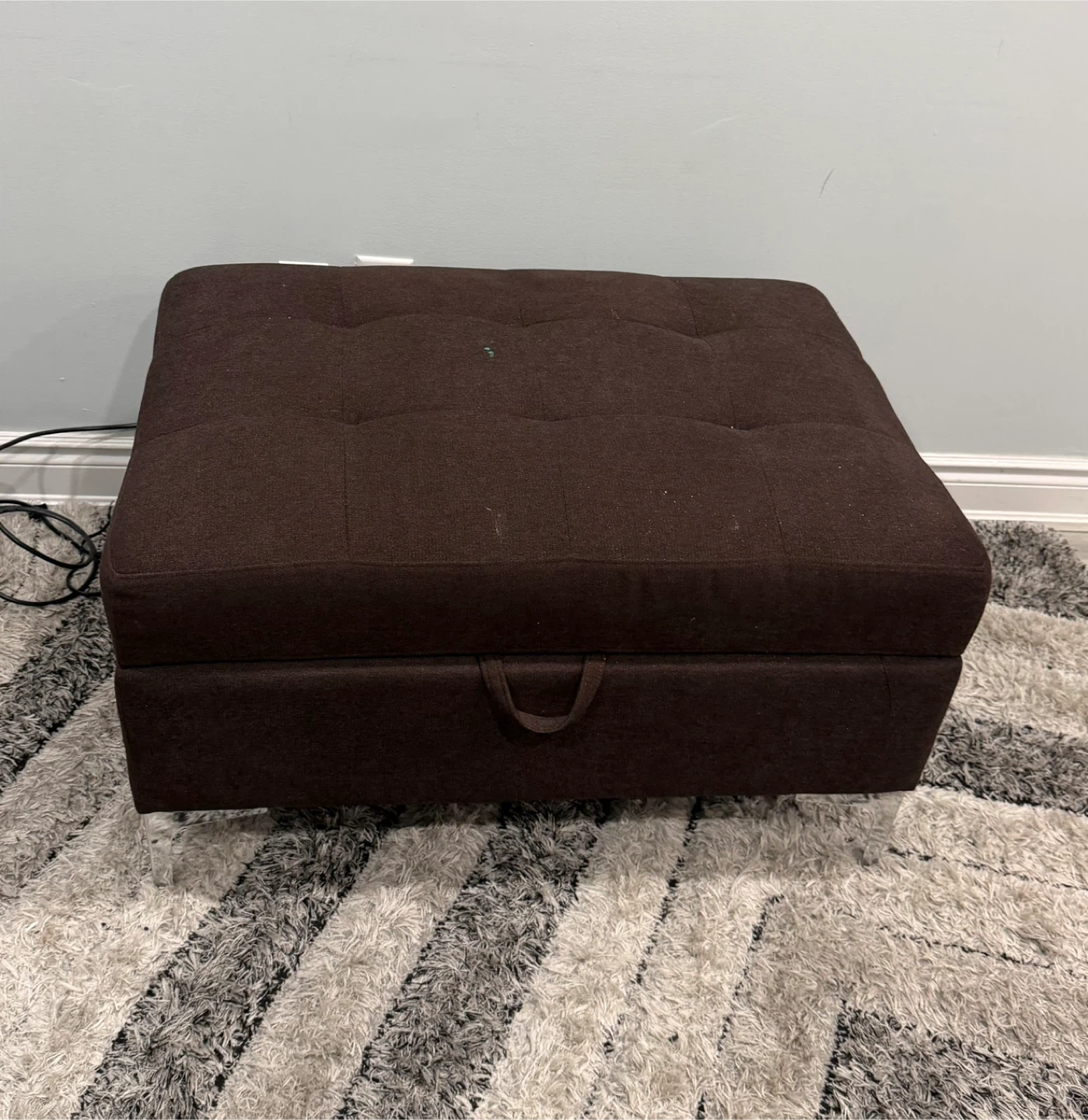 This ottoman features a tufted microfiber top and a hidden storage compartment. Its chocolate colour and versatile design make it a great addition to any room. Storage ottoman with lift-top.
