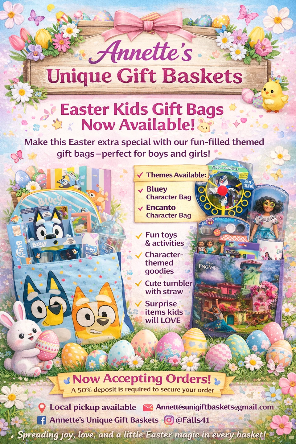 Annette's Unique Gift Baskets offers fun-filled Easter gift bags perfect for boys and girls! Choose from Bluey or Encanto character themes, packed with toys, activities, and goodies. Each bag includes a cute tumbler with a straw and surprise items kids will love! Get your pre-orders in now for a magical Easter.