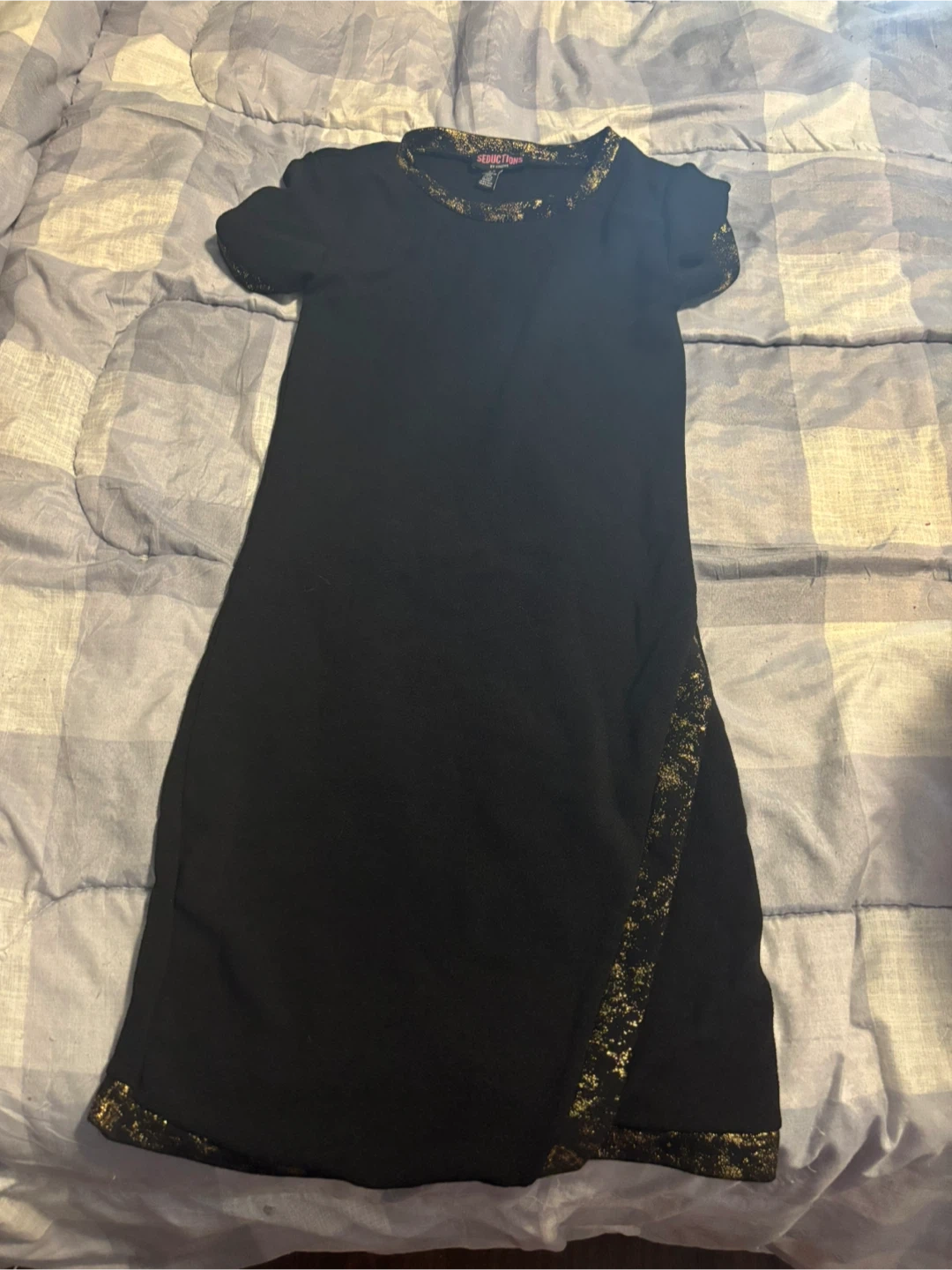 This black dress by Seductions by Sirens features a sparkling gold trim around the neckline, cuffs, and a side slit. It's a size S/P. The fabric has a textured waffle-like appearance. Perfect for a night out!