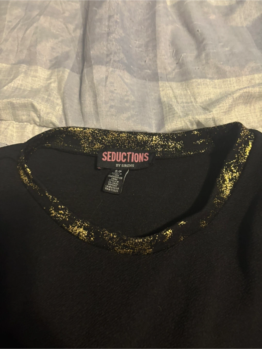 This black dress by Seductions by Sirens features a sparkling gold trim around the neckline, cuffs, and a side slit. It's a size S/P. The fabric has a textured waffle-like appearance. Perfect for a night out!