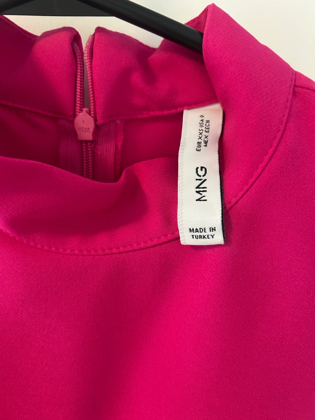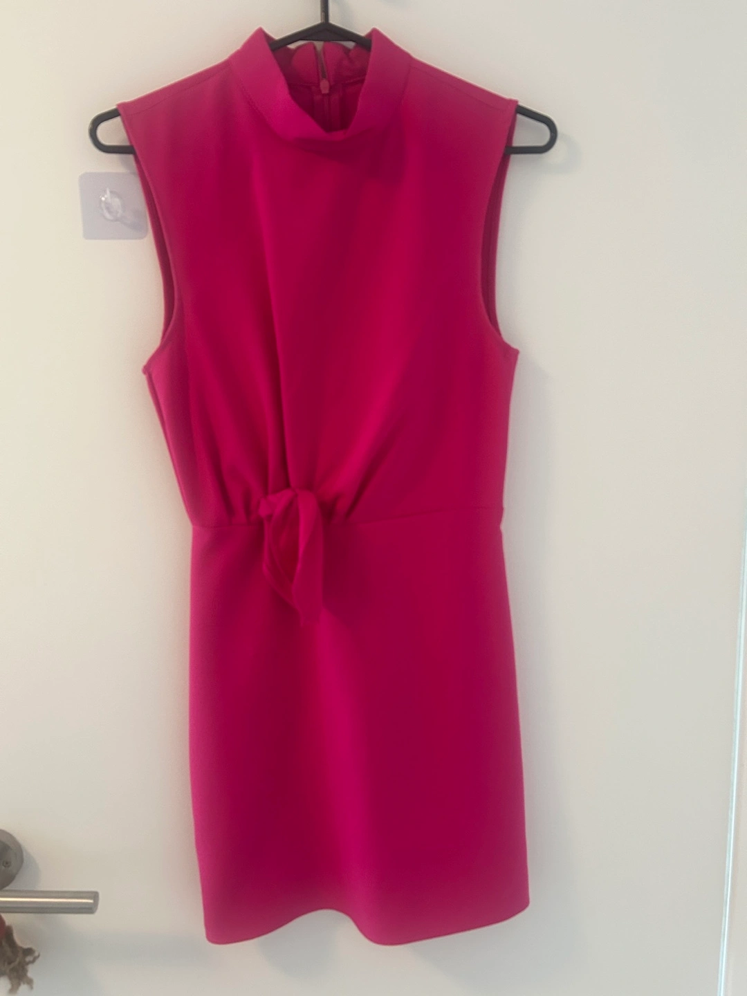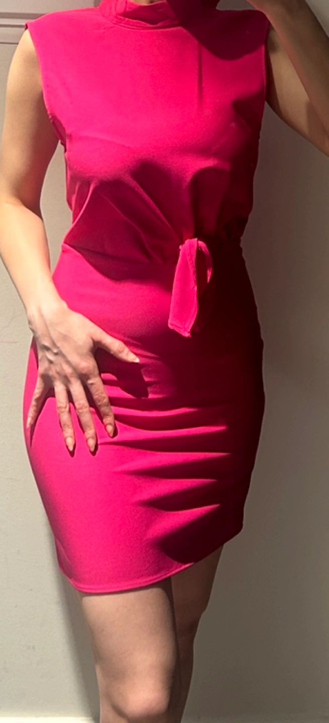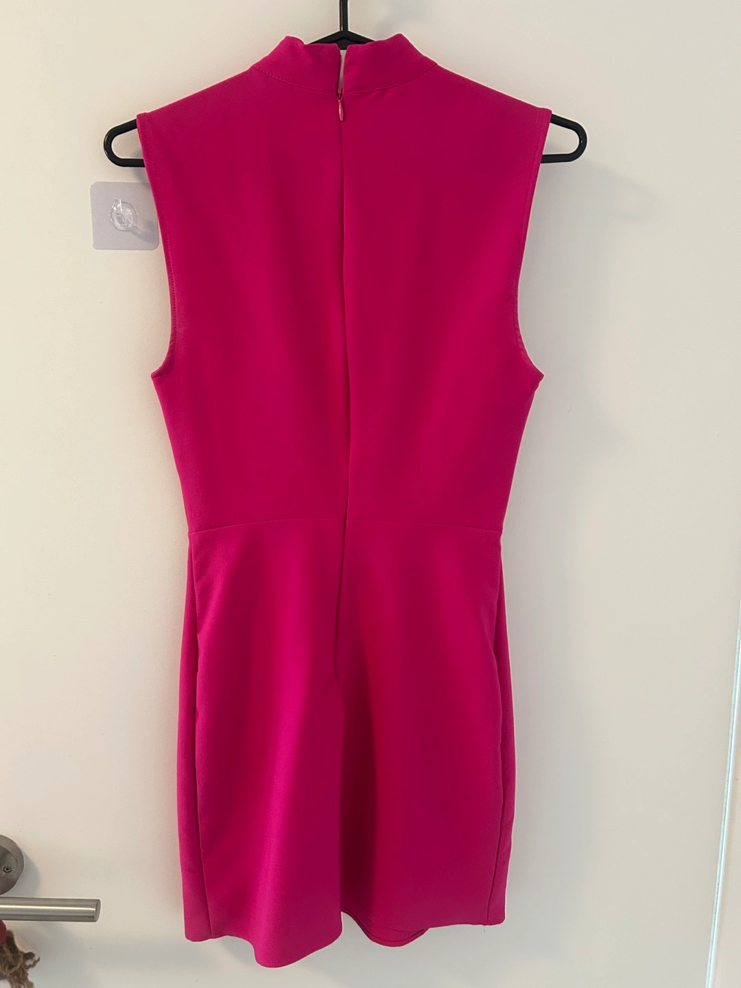 Fuchsia pink mini dress. Mock neck, sleeveless. Front knot detail. Back zipper closure. Size small.