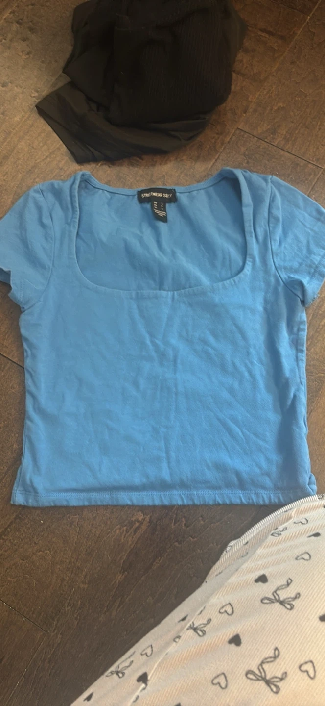 Selling a light blue top from Streetwear Sqy. It's a size small and in great condition! The square neckline is super cute and flattering