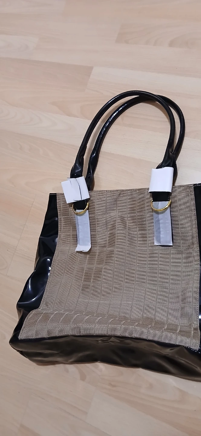 This tote bag features a patterned beige fabric body with glossy black patent leather accents and handles. It has gold hardware details. It's a stylish accessory for everyday use.