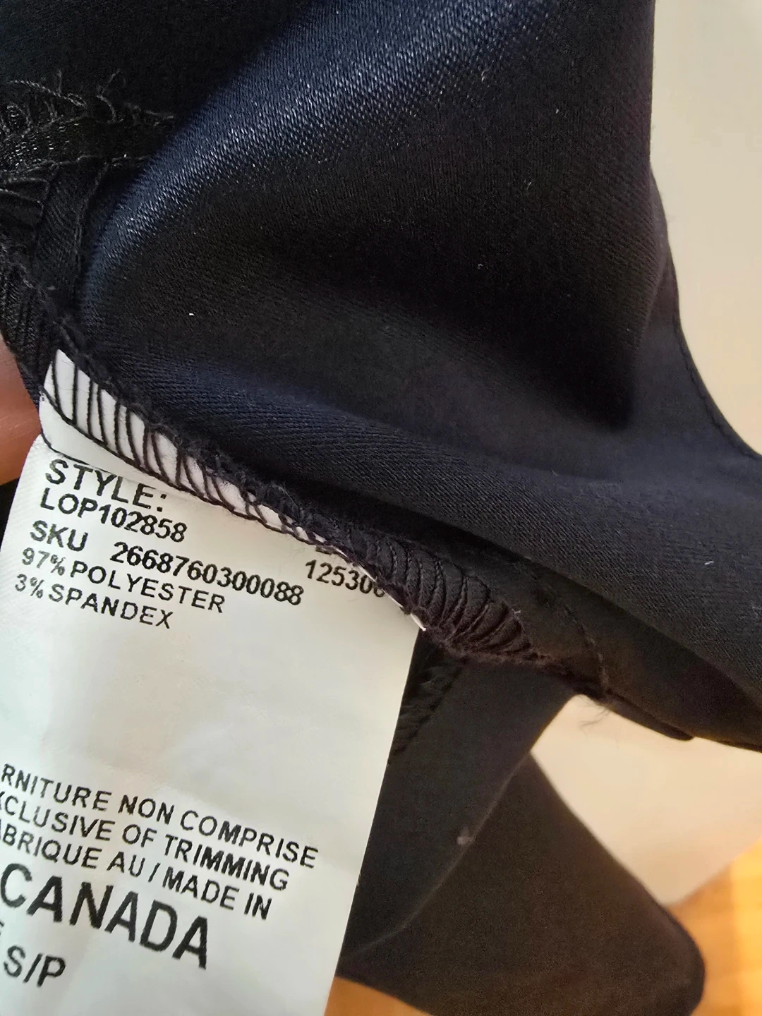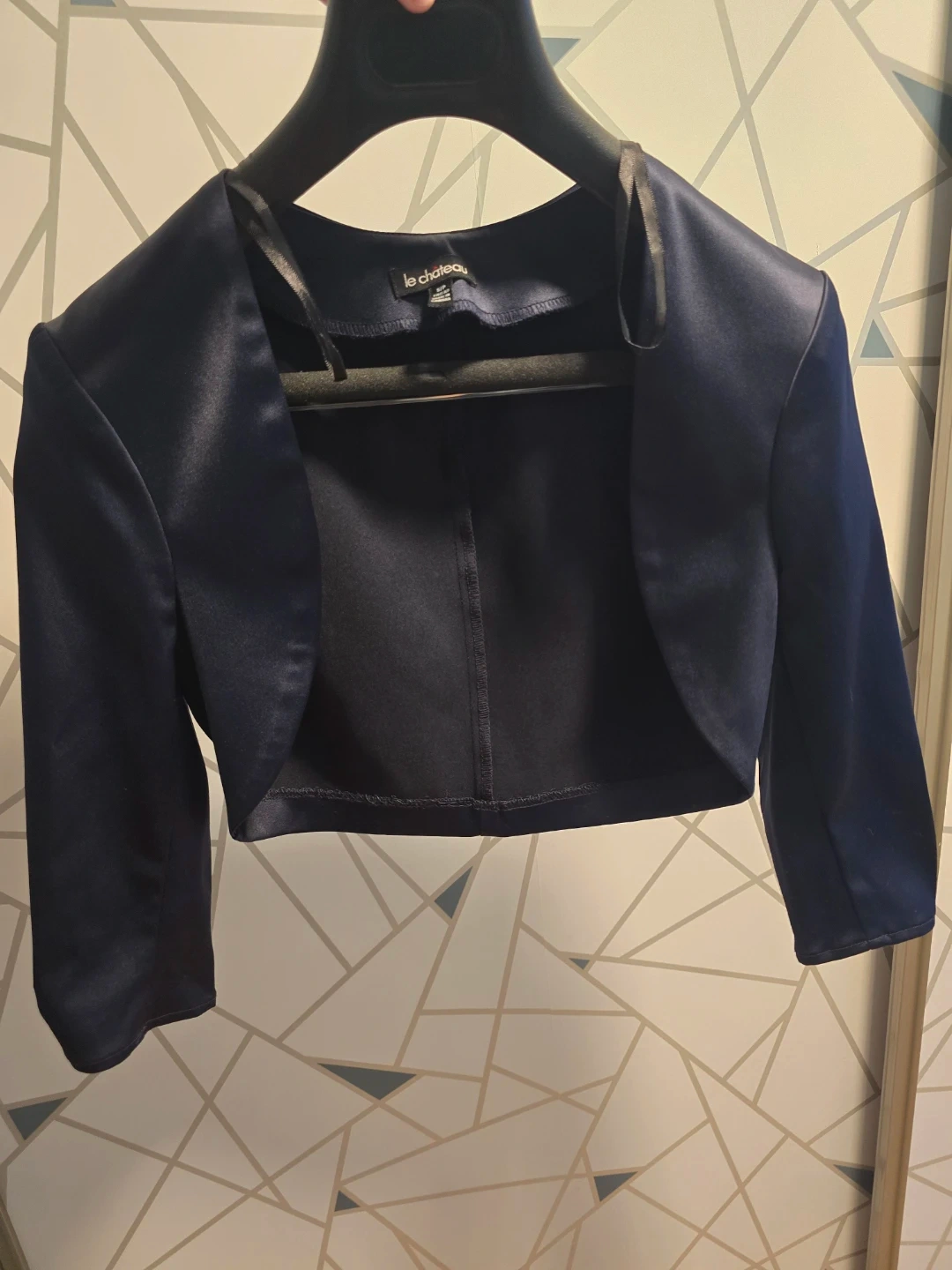 This is a Le Chateau navy blue satin bolero jacket. It's made of 97% polyester and 3% spandex. The jacket is size S/P and was made in Canada. Great addition for formal dresses/jumpsuits.