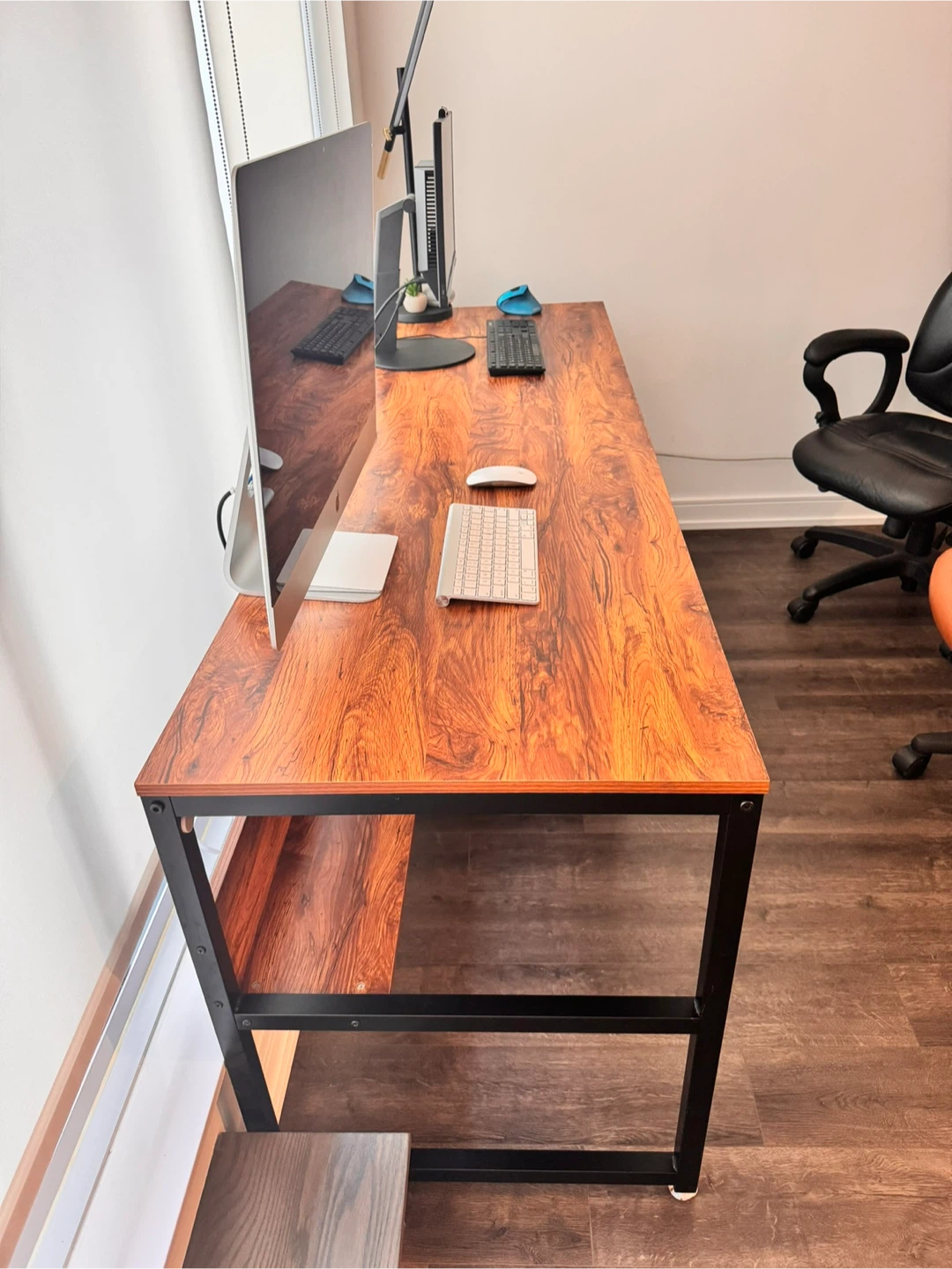 This spacious desk features a wood-grain laminate top and a black metal frame. It includes two built-in shelves for convenient storage. A great setup for a home office or workspace!
