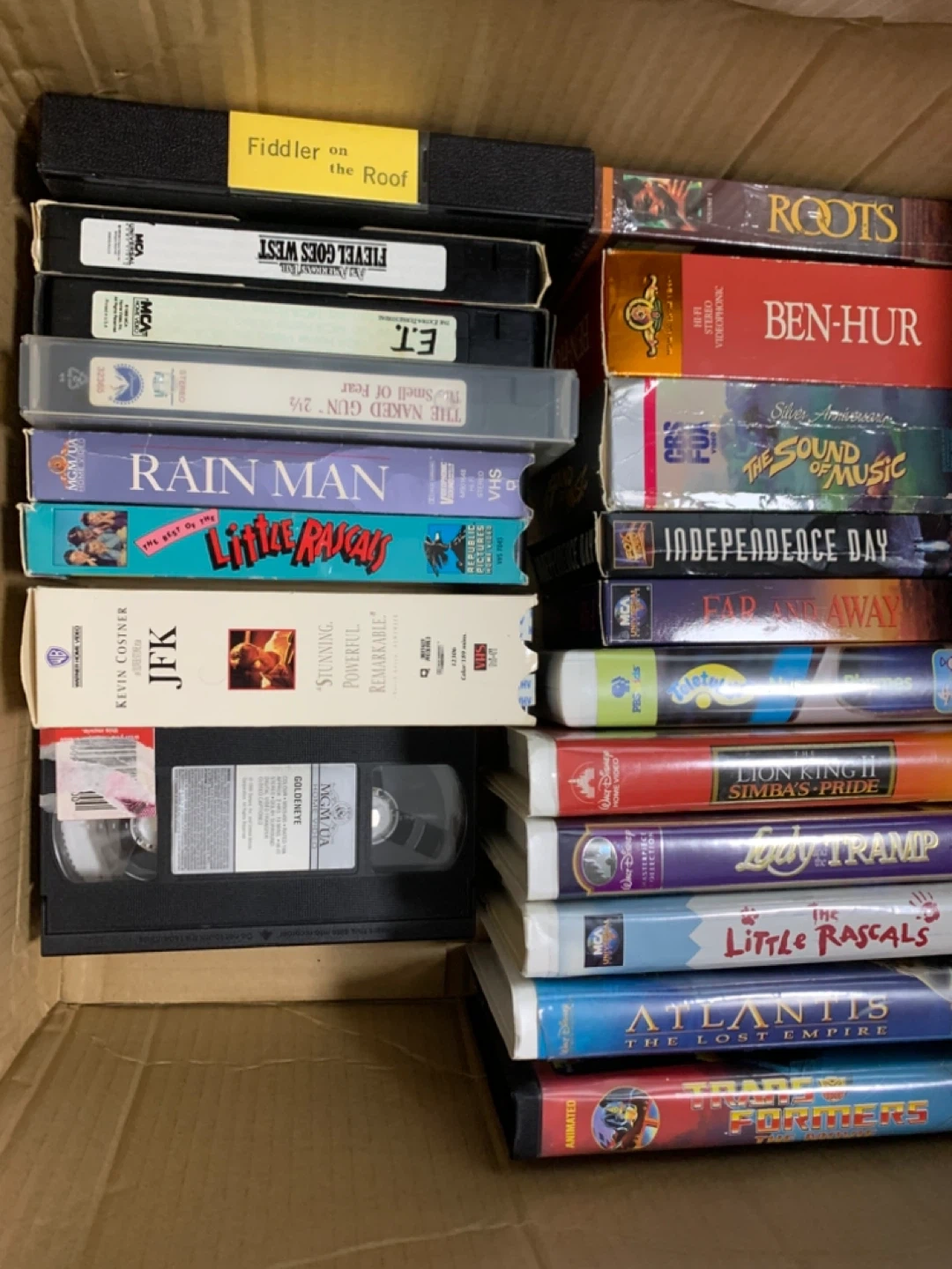 Selling a collection of VHS tapes! Titles include: - Fiddler on the Roof - Fievel Goes West - E.T. - The Naked Gun 2 1/2 - Rain Man - The Best of The Little Rascals - JFK - Goldeneye - Roots - Ben-Hur - The Sound of Music - Independence Day - Far and Away - The Lion King II: Simba's Pride - Lady and the Tramp - The Little Rascals - Atlantis: The Lost Empire - Fritters