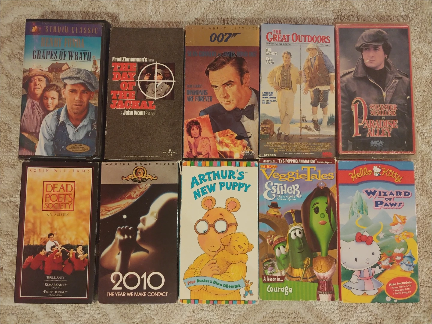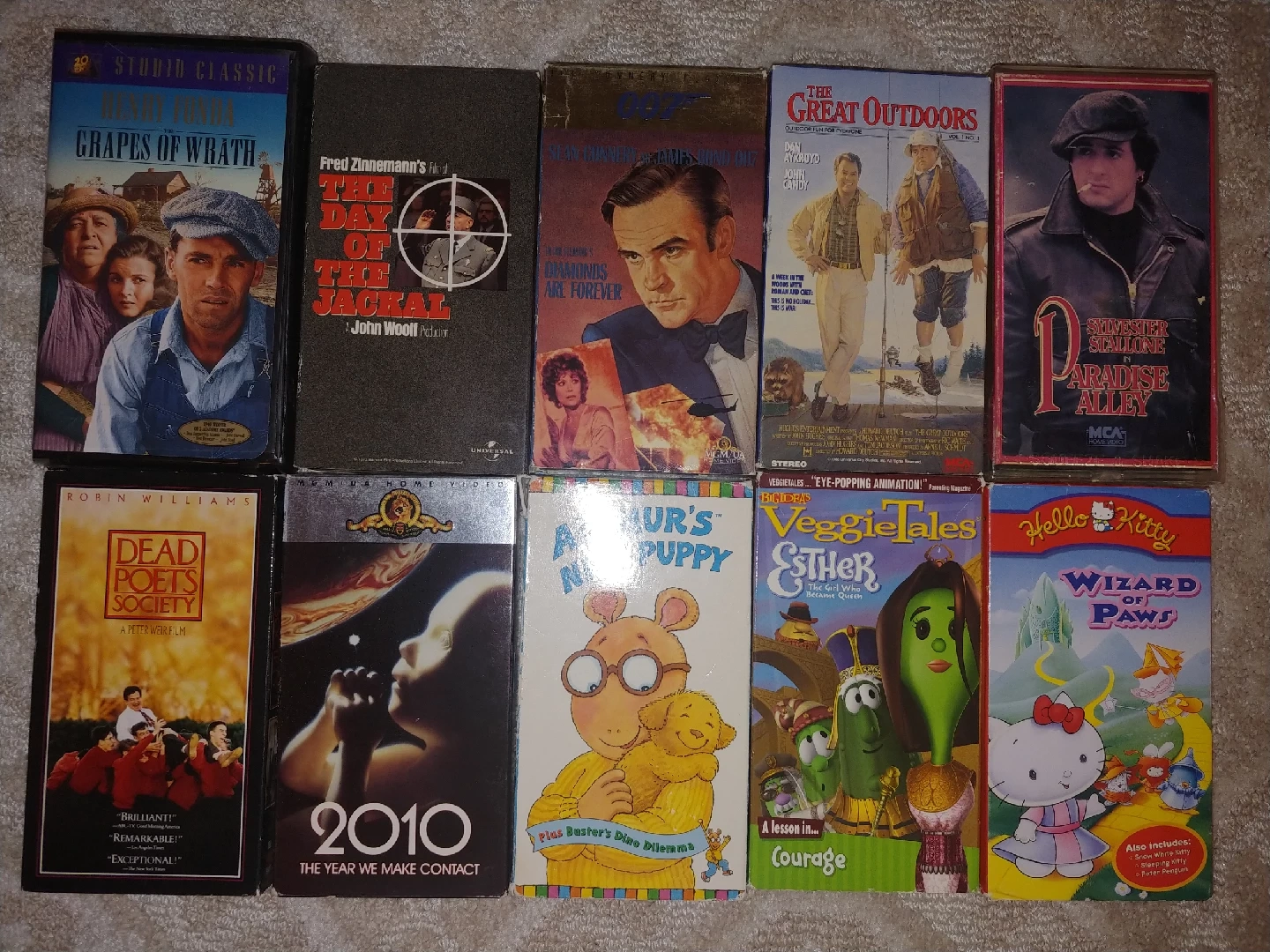 17Selling a collection of VHS tapes! Titles include: Grapes of Wrath, The Day of the Jackal, Diamonds Are Forever (007), The Great Outdoors, Paradise Alley, Dead Poets Society, 2010 The Year We Make Contact, Arthur's New Puppy, VeggieTales Esther, and Hello Kitty Wizard of Paws price: $2 per movie, $5 for 5 movies, $10 for whole set