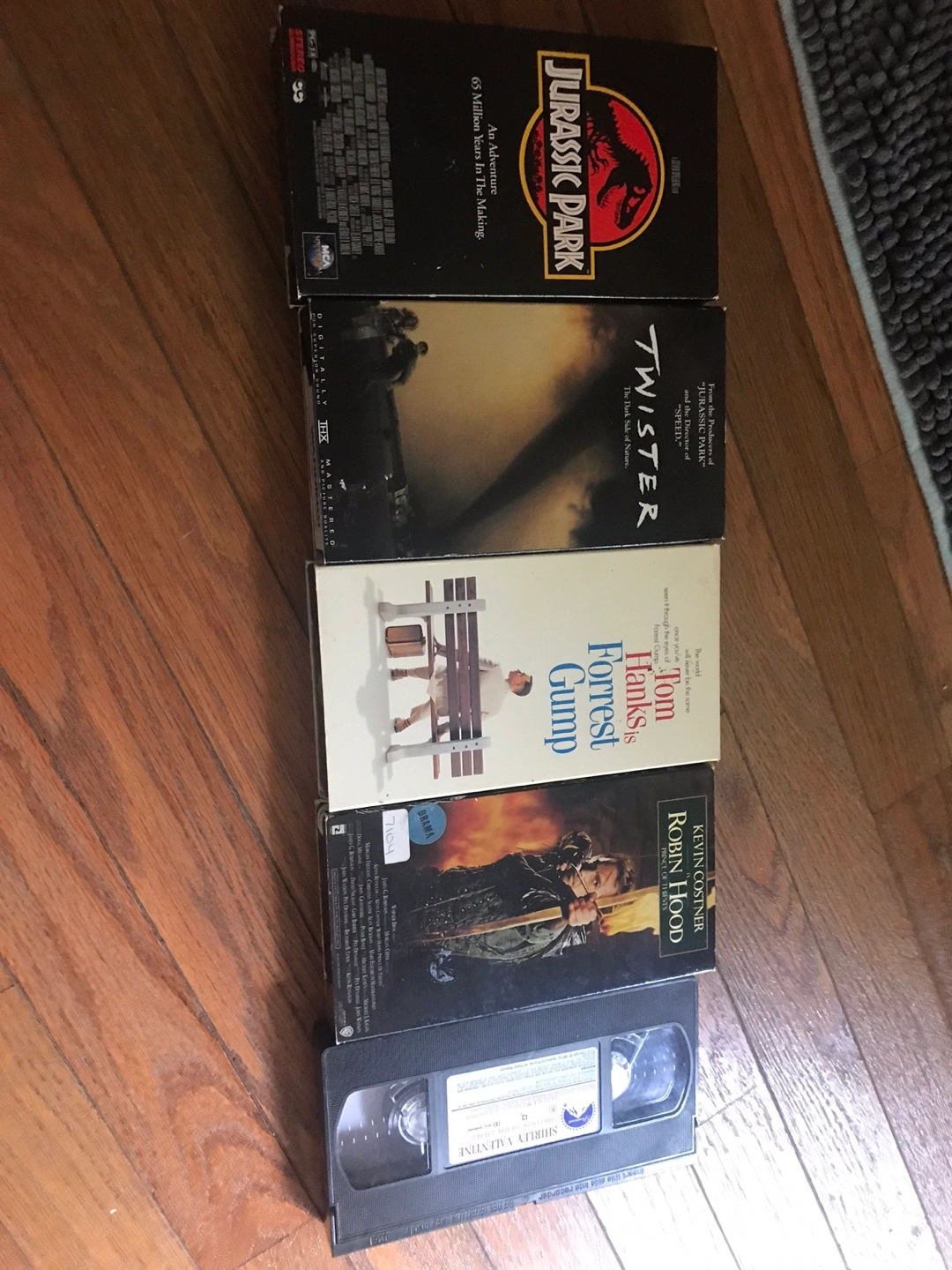 8$ for all. Selling a collection of VHS tapes! Includes: - Jurassic Park: An Adventure 65 Million Years In The Making - Twister: From the Producers of "Jurassic Park" and the Director of "Speed", The Dark Side of Nature - Forrest Gump: The world will never be the same once you've seen it through the eyes of Forrest Gump - Robin Hood starring Kevin Costner - Shirley Valentine