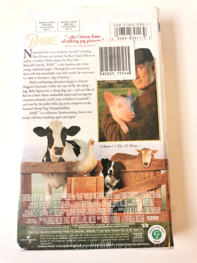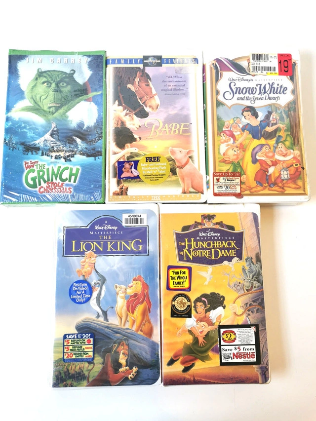 55Immerse yourself in the magic of Disney with this classic VHS collection featuring beloved characters from The Hunchback of Notre Dame, The Grinch Who Stole Christmas, The Lion King, Snow White and the Seven Dwarfs, and Babe. Each tape offers a delightful viewing experience of these timeless animated tales, perfect for family movie nights or adding to your vintage media collection. The tapes are in English and have been rated G, making them suitable for audiences of all ages. Dive into the enchanting worlds of animation, brought to you by the renowned Disney studio. These VHS tapes are a nostalgic nod to the charm and simplicity of classic storytelling. NOTE: All in original packaging however may be punctured from moving items.