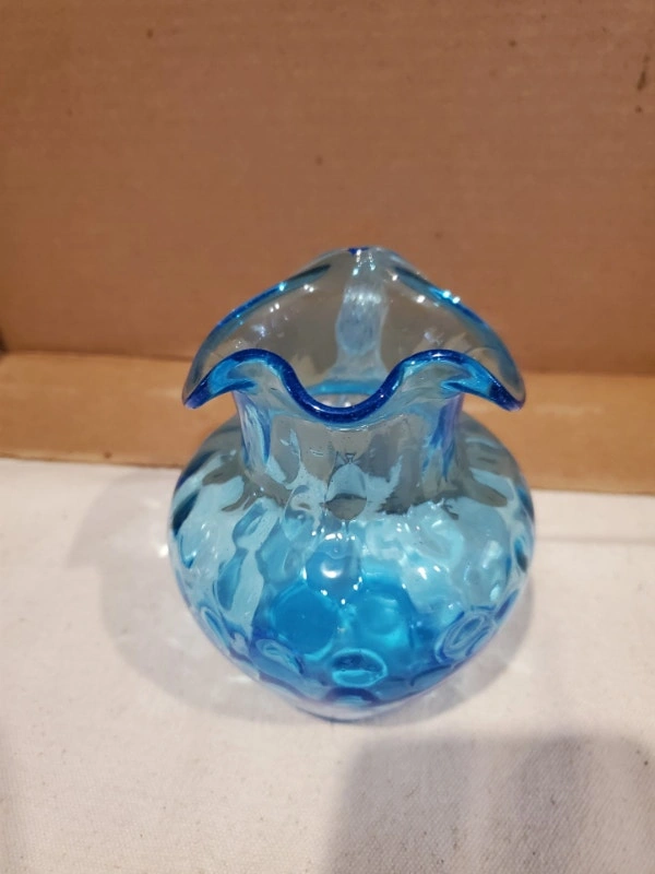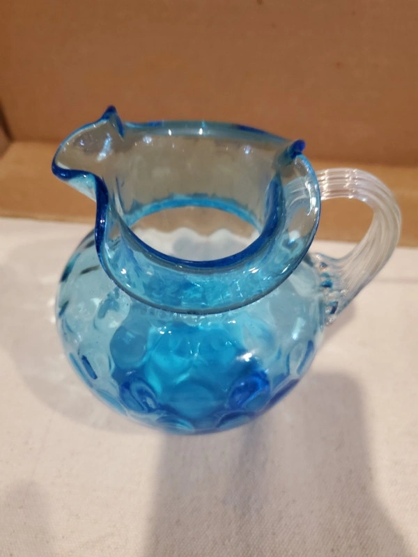 A nice little blue art glass jug/pitcher. It's about the size of a creamer. It's handblown glass in a vibrant blue, with a clear glass handle. The body is dimpled and it stands about 4.5" tall, without cracks or chips. $10.00, pick up only.