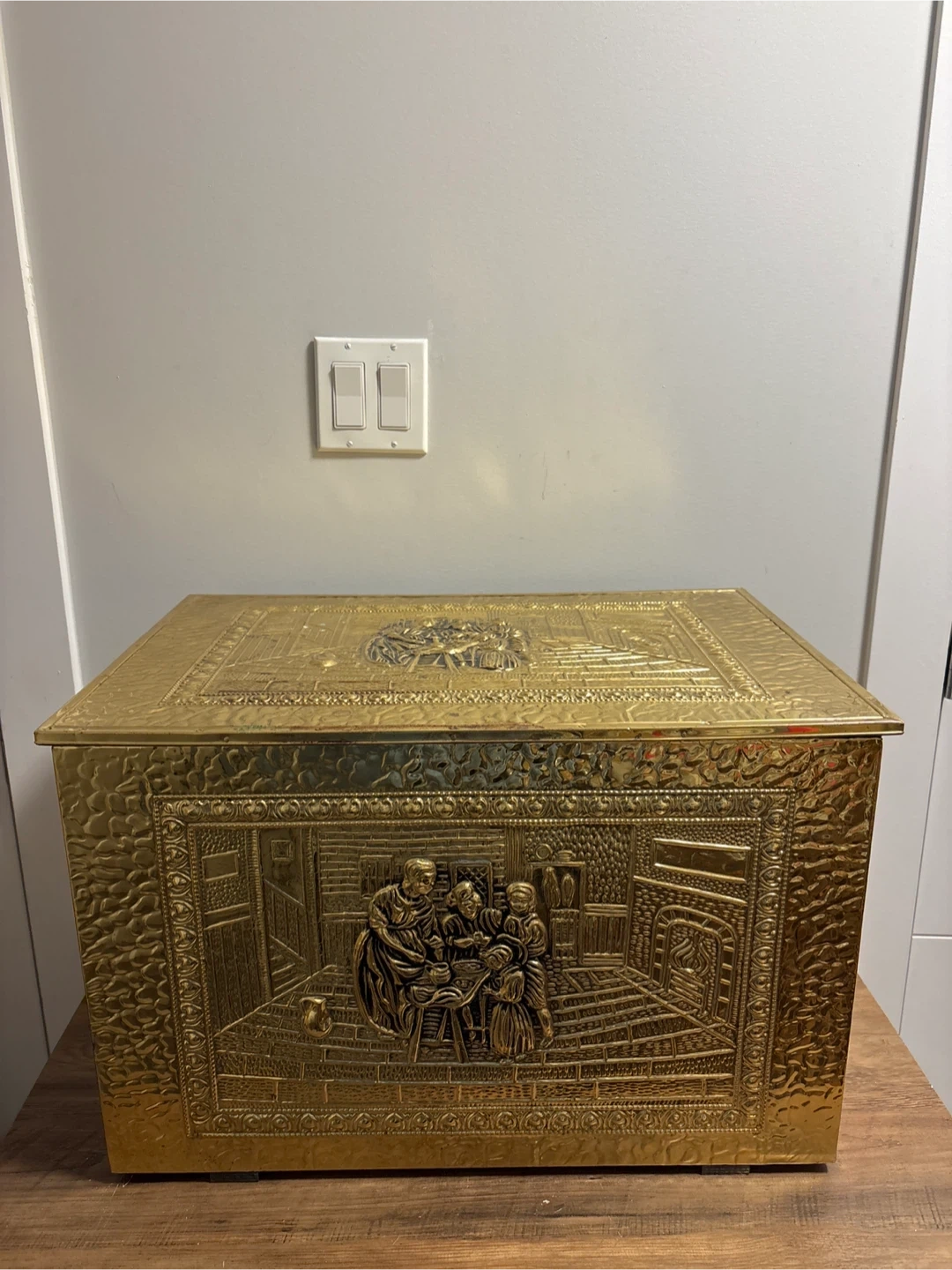 Decorative brass chest with detailed embossed scenes. It's perfect for storing blankets, firewood, or toys. Hinged lid and sturdy construction.