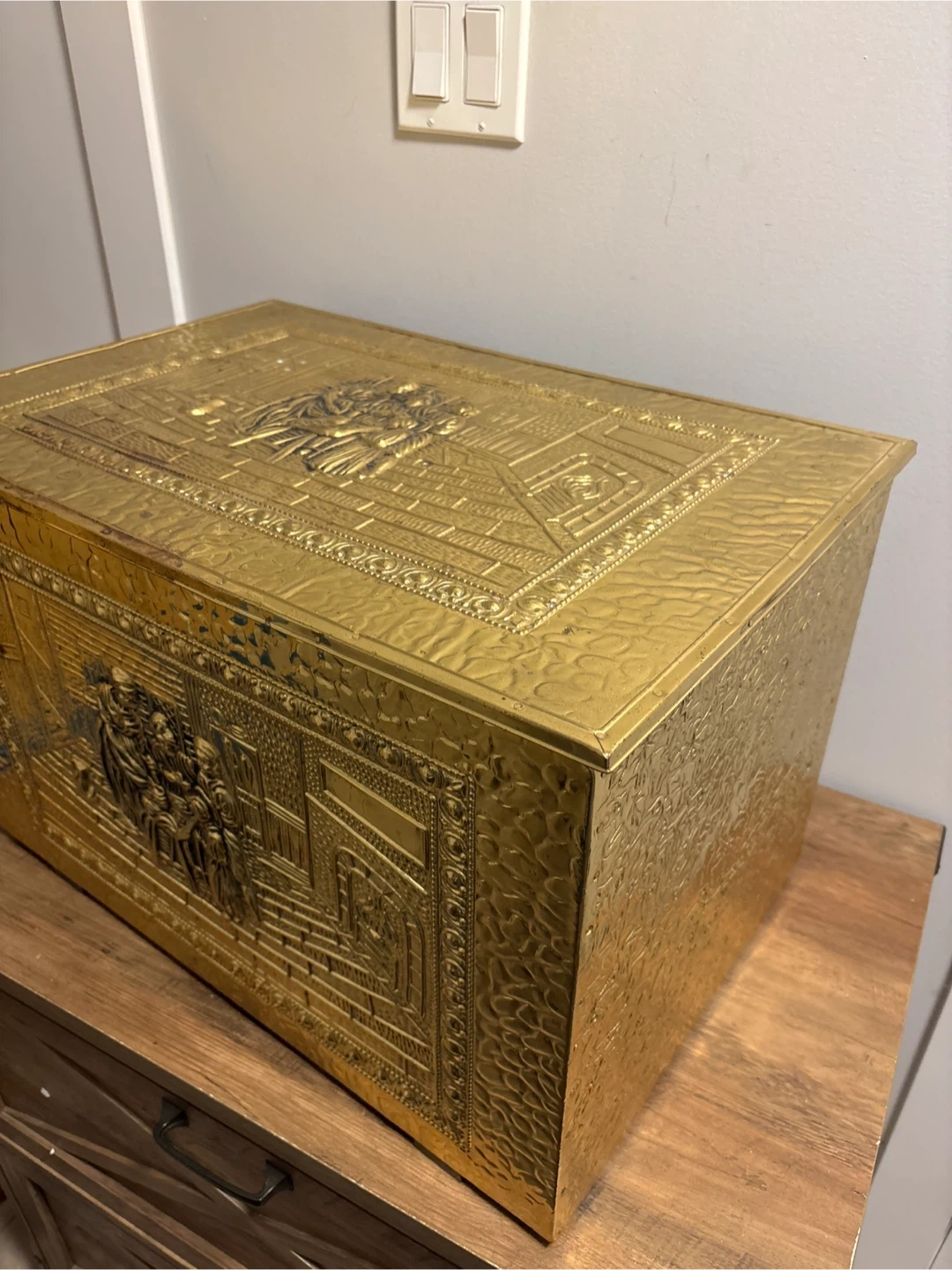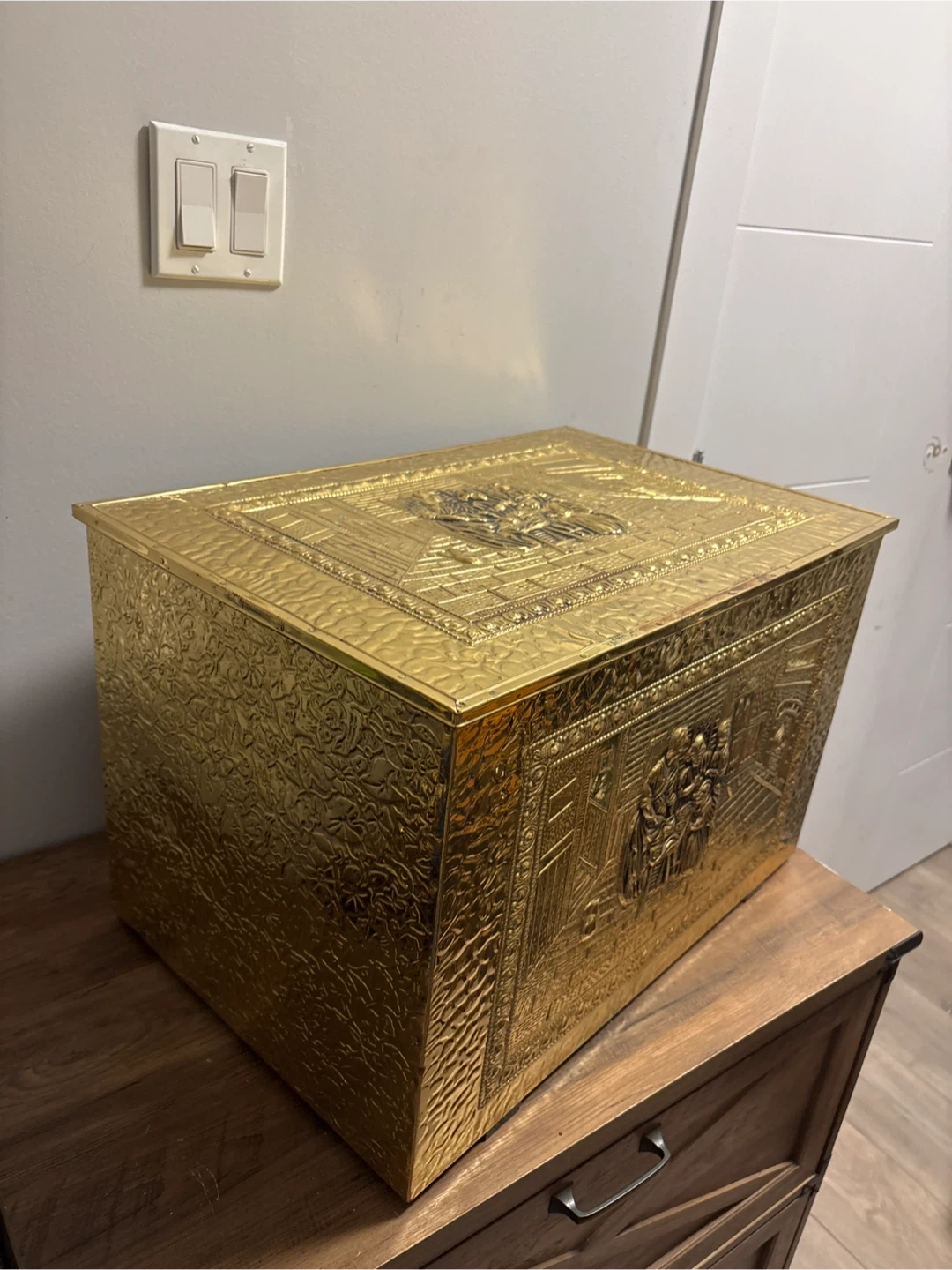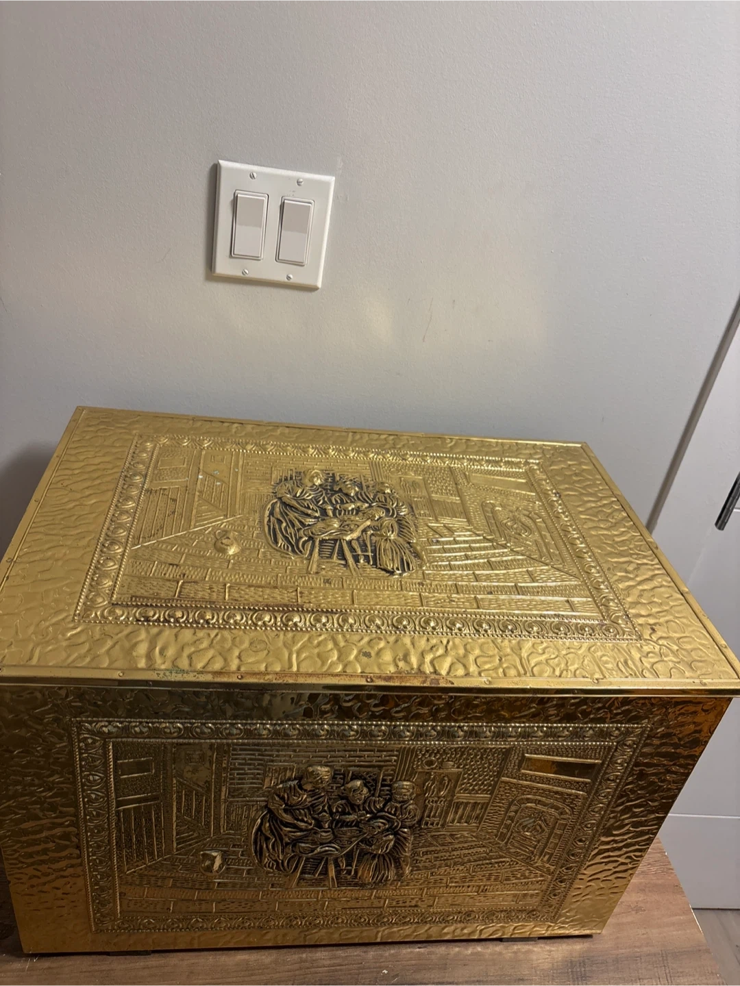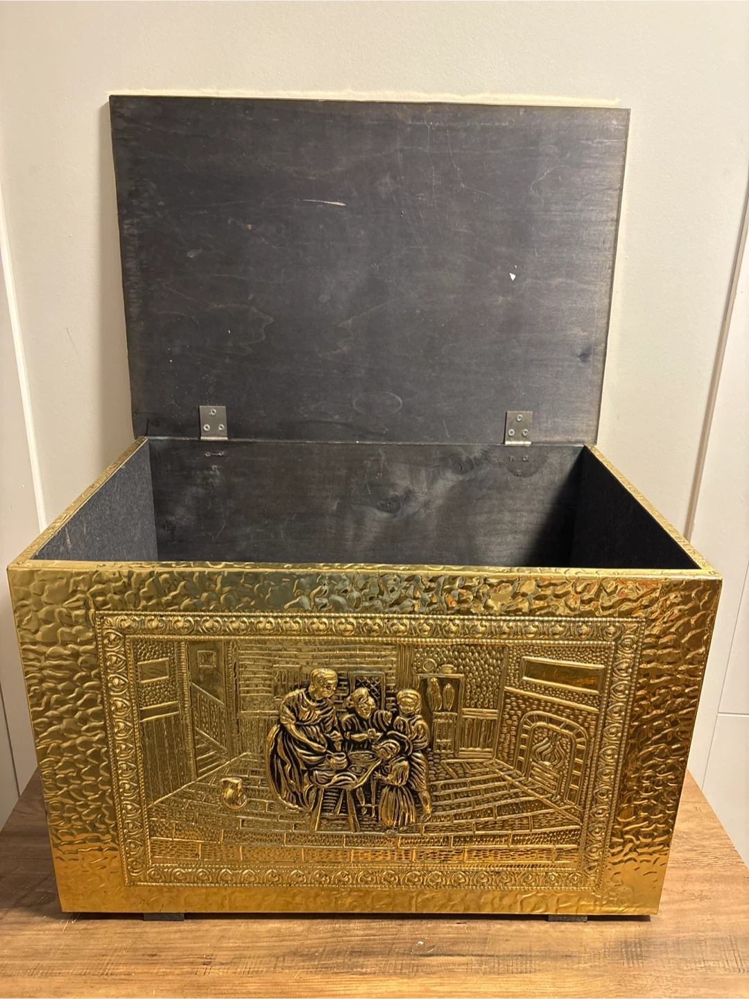 Decorative brass chest with detailed embossed scenes. It's perfect for storing blankets, firewood, or toys. Hinged lid and sturdy construction.