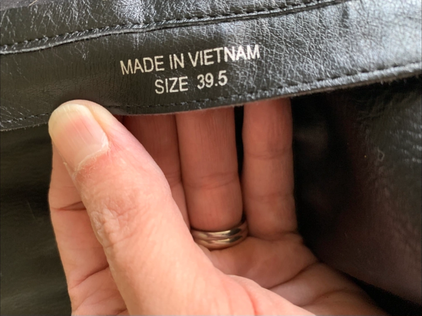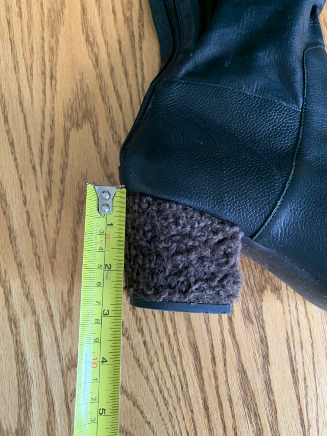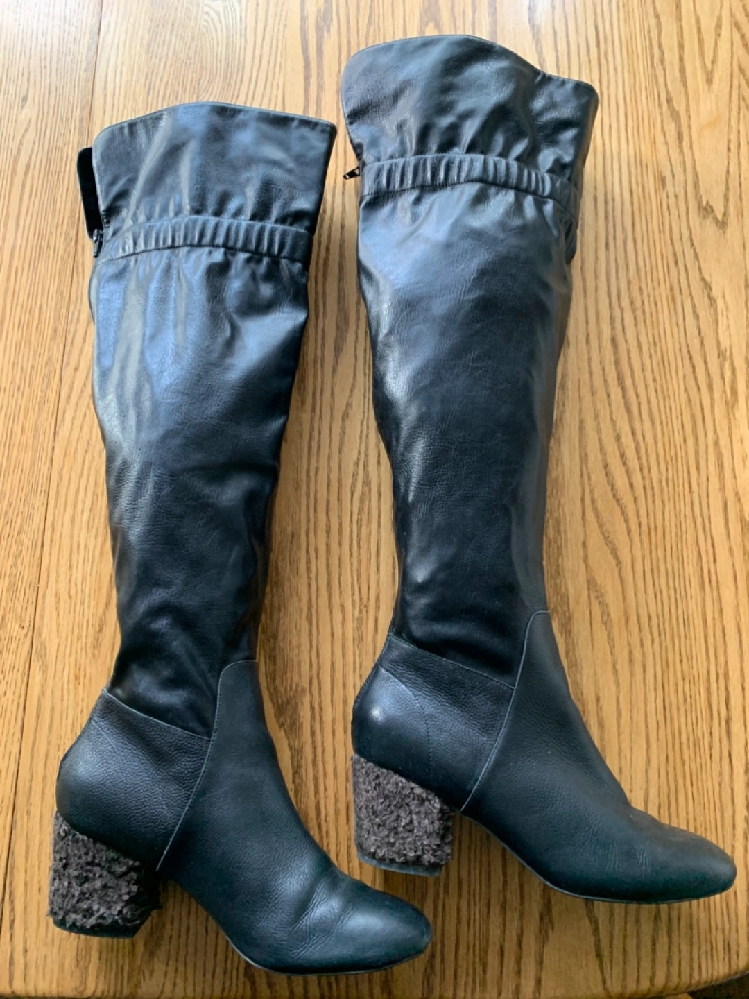 Selling a pair of black leather knee-high boots. They have a unique heel texture and a stylish, slightly slouchy upper. There is a small mark on the leather, as shown in the photos, but otherwise they are in good condition!