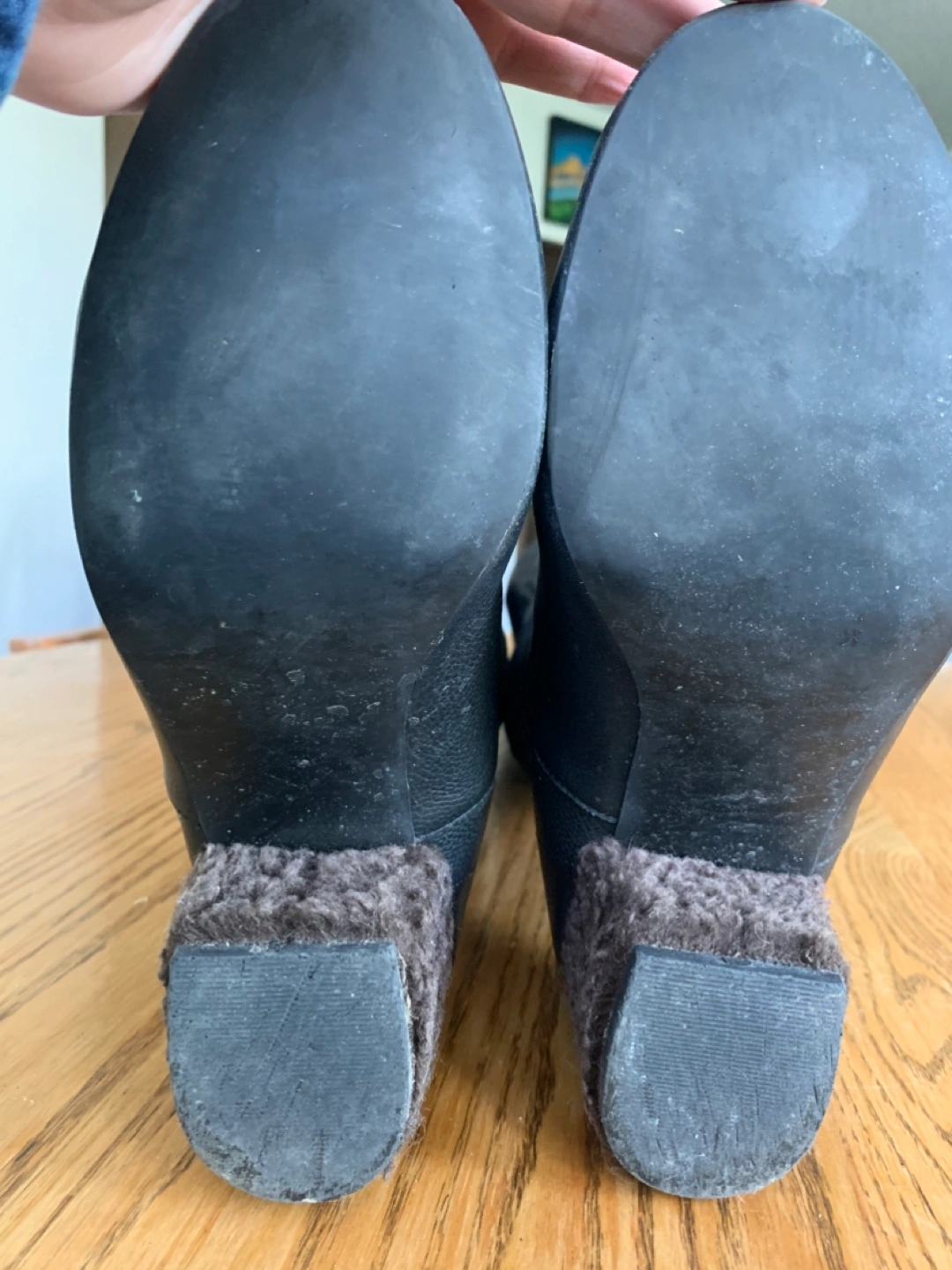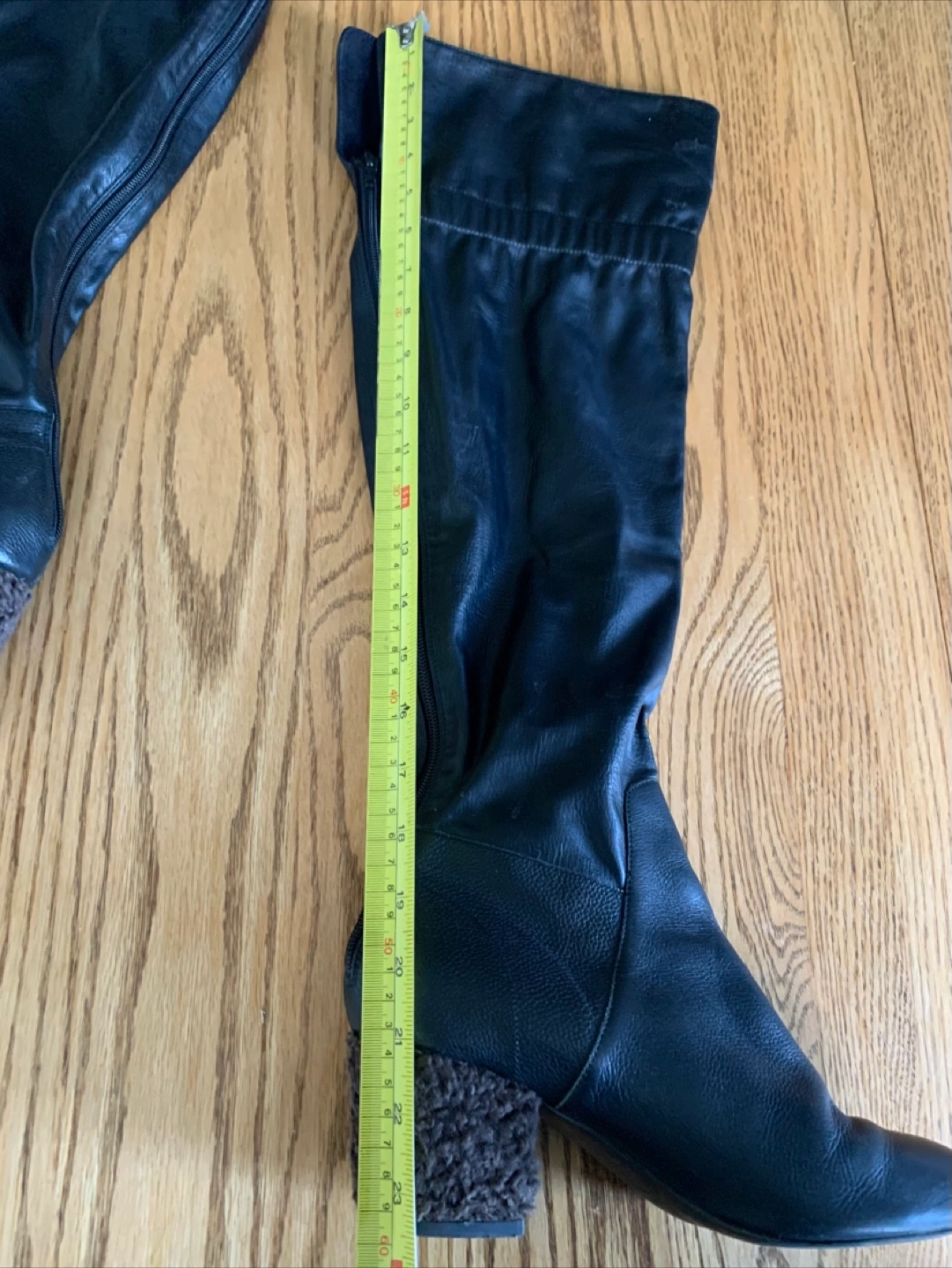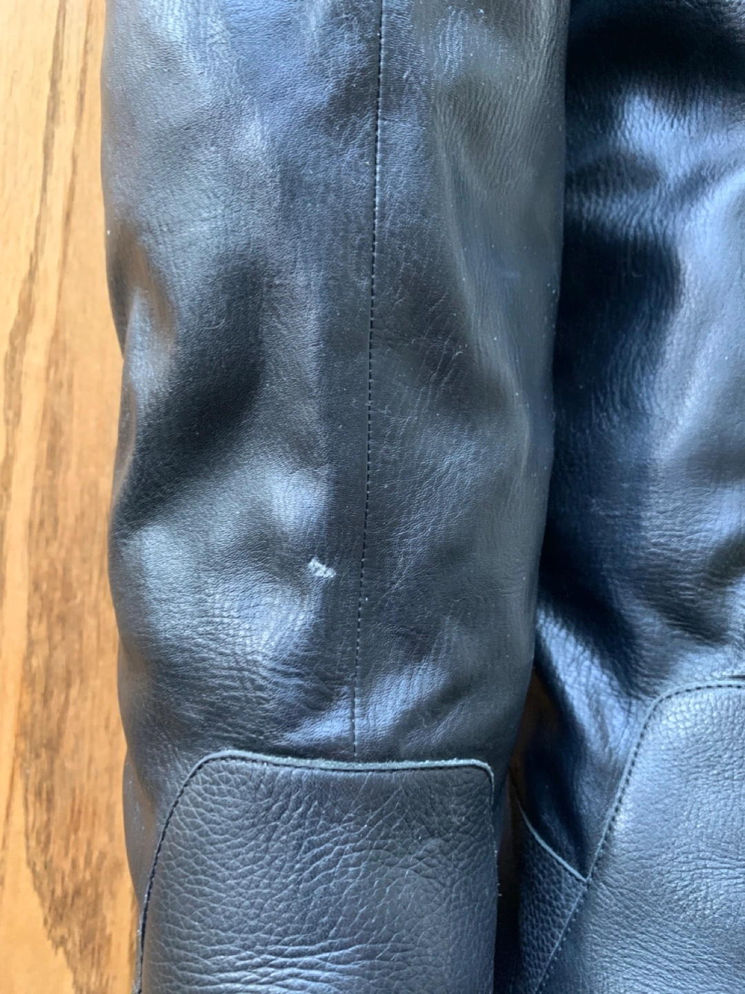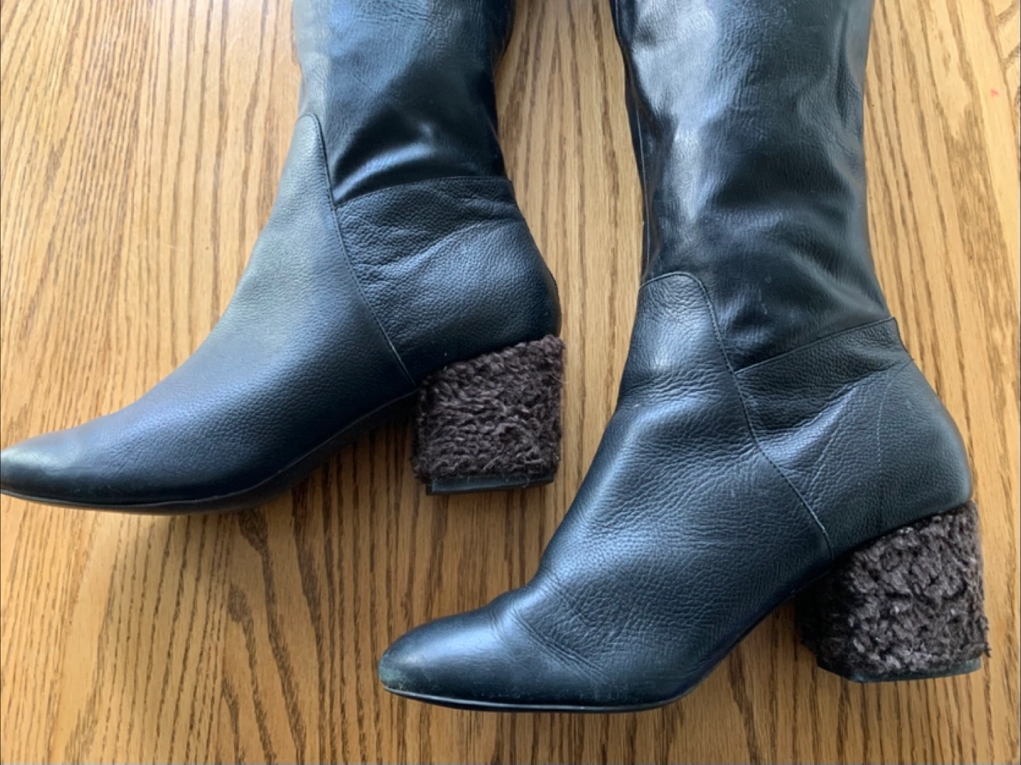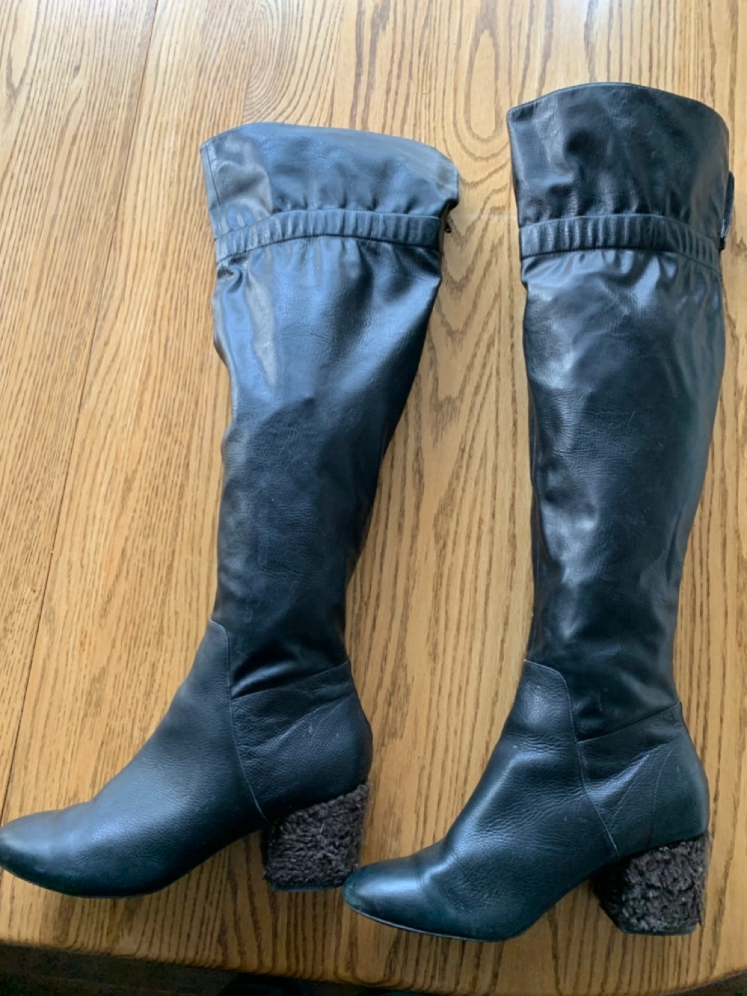 Selling a pair of black leather knee-high boots. They have a unique heel texture and a stylish, slightly slouchy upper. There is a small mark on the leather, as shown in the photos, but otherwise they are in good condition!